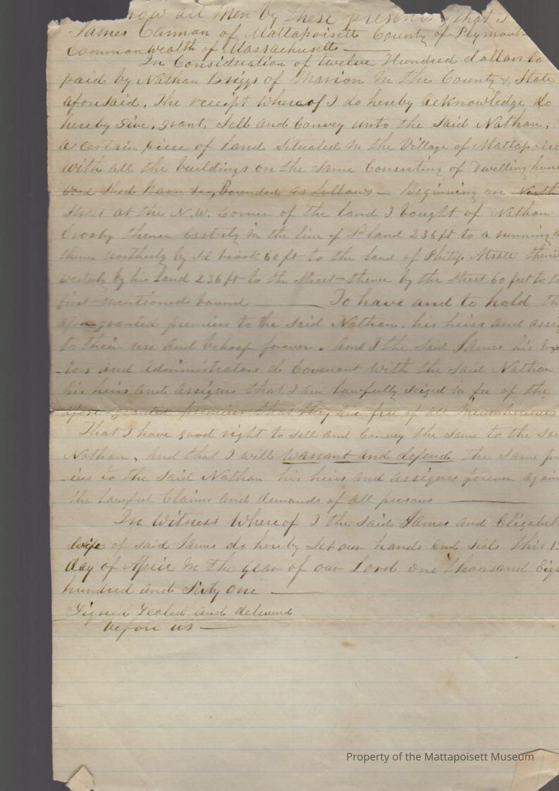 James & Elizabeth Cannon to Nathan Briggs of Marion, for $1,200 land in Mattapoisett Village with buildings.Collection