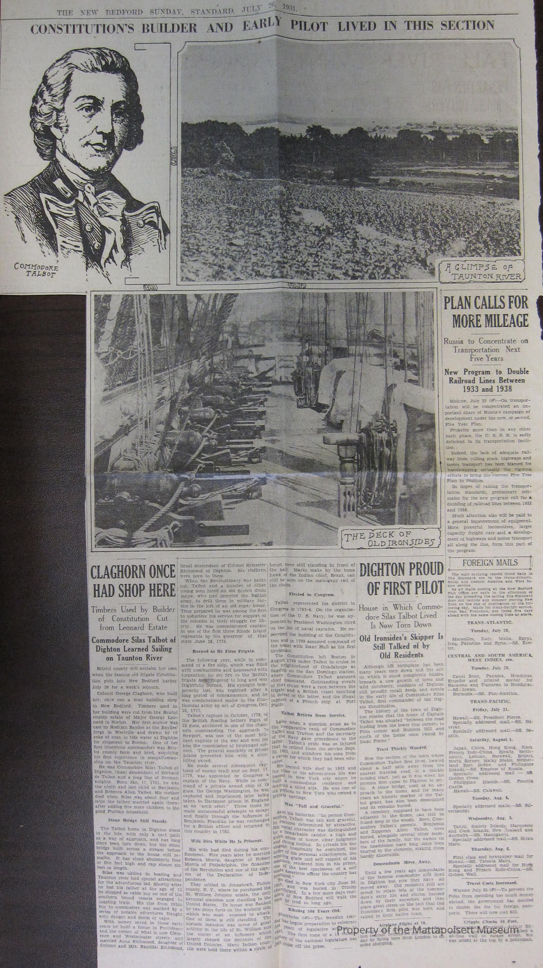New Bedford Sunday Standard, July 26, 1931, Constitution's builder and early pilot lived in this section. Claghord once had shop here, timbers used by builder of Constitution cut from Leonard Estate, Commodore Silas Talbot of Dignton learned sailing on Taunton River.Collection
