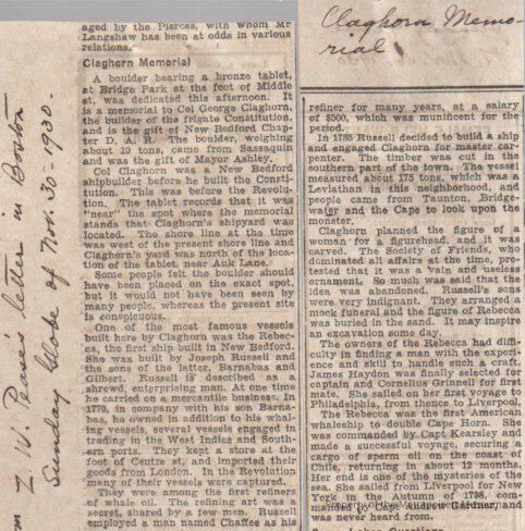 Boston Sunday Globe, November 30, 1930, from Z. W. Pease's letter. Claghorn Memorial. Two pieces.Collection