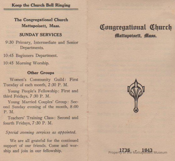 Program from the Congregational Church, Mattapoisett, Mass. 1736-1943. Plea for funds for church bell and program.Collection