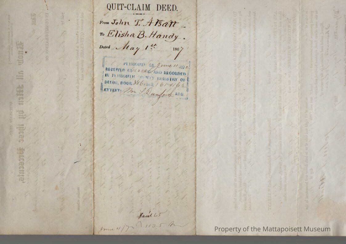 John T. & Mary Atsatt to Elisha B. Handy, land on Pearl Street in Mattapoisett Village for $5.Collection