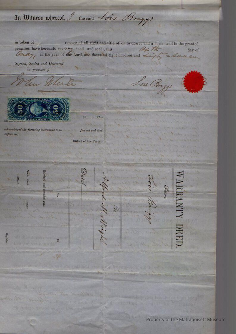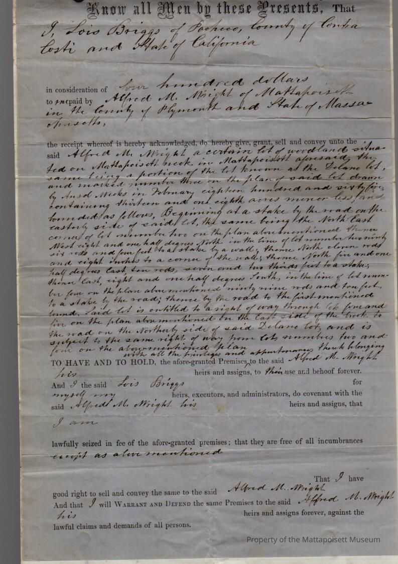 Lois Briggs of California to Alfred M. Wright, for $400 woodland on Mattapoisett Neck, lot #3 of “Delano Lot” containing 13 1/8 acres.Collection