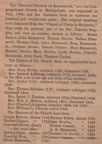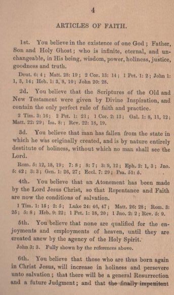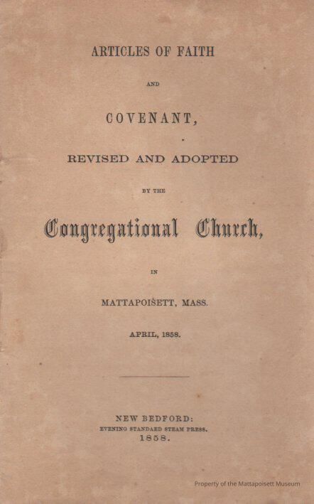 Articles of Faith and Covenant, revised and adopted by the Congregational Church in Mattapoisett, Mass. April 1858. Includes history of ministry, articles of faith, convenant, form of admission, transfer of membership and catalog of the present members of the church. Had .56 tucked in.Collection