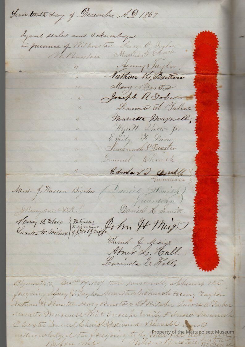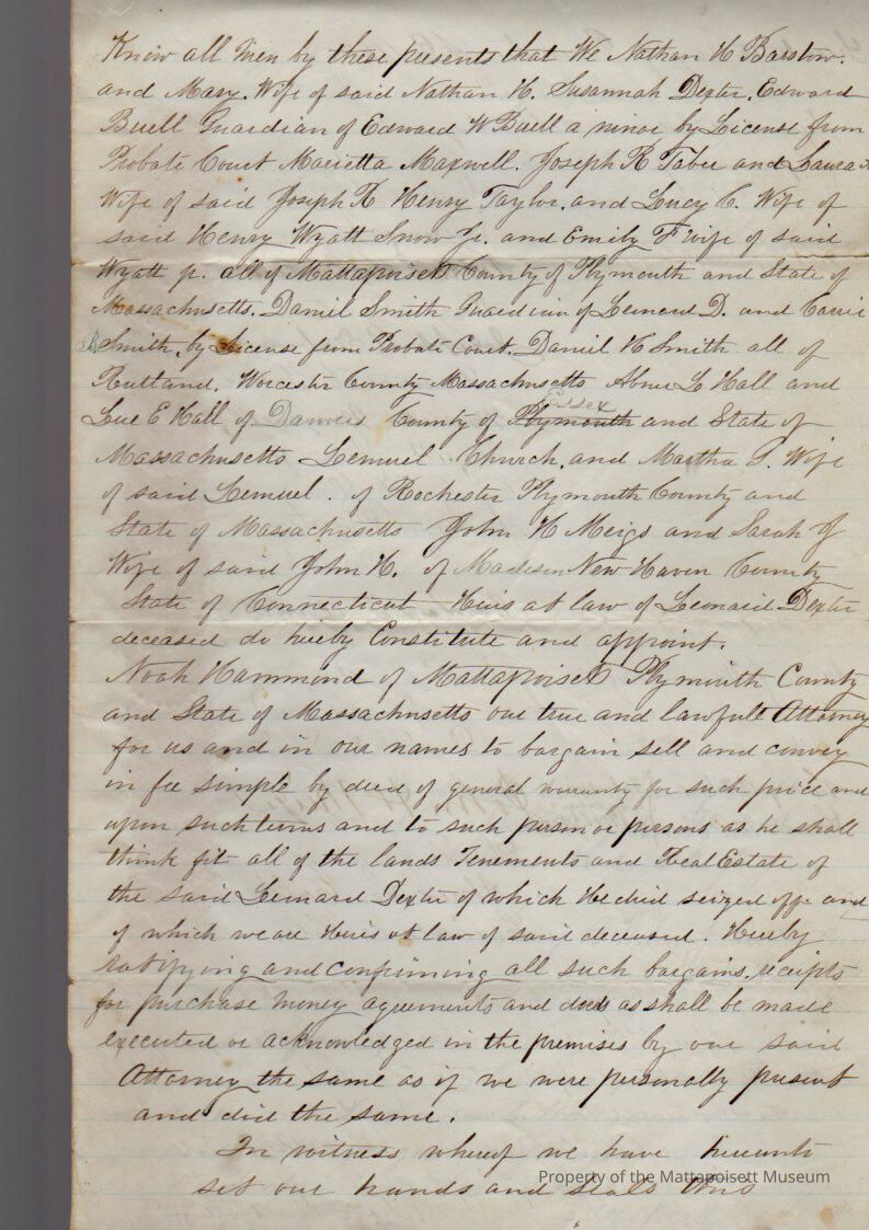 Heirs-in-law of Leonard Dexter (Nathan H. & Mary Barstow, Susanna Dexter, Edward Buell, guardian of Edward W. Buell, Marietta Maxwell, Joseph R. & Laura A. Taber, Henry & Lucy C. Taylor, Wyatt & Emily F. Snow Jr. Daniel Smith, Abner L. & Lucina E. Hall, John N. & Sarah Y. Meigs, Lemuel & Martha G. Church) appointing Nathan H. Barstow as attorney for sale of real estate.Collection