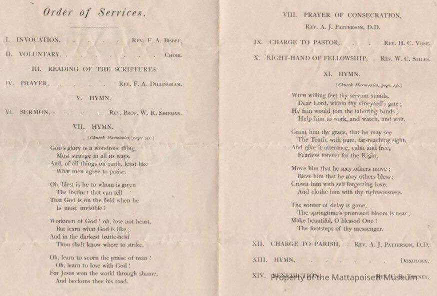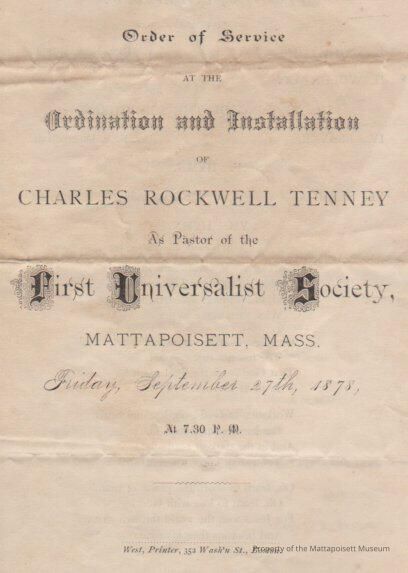 Order of Service at the Ordinatoin and Installation of Charles Rockwell Tenney as pastor of the First Universalist Society in Mattapoisett, Mass. Friday, September 27th, 1878 at 7:30pm.Collection