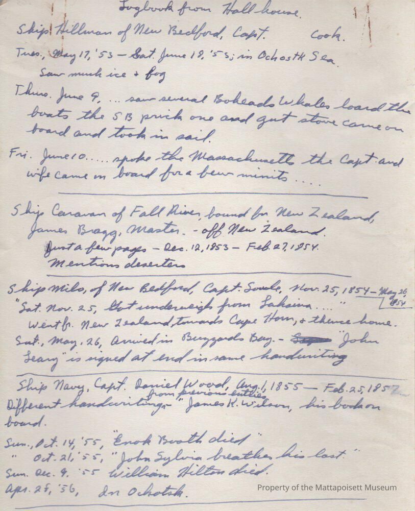 Notes from log book at Hall House. Mentions Ship "Hillman", Ship "Caravan", Ship "Milo", Ship "Navy"Collection