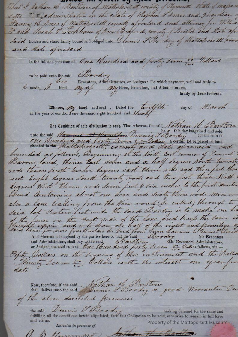Nathan H. Barstow, administrator to estate of Stephen S. Ames, guardian of Fanny H. Ames and attorney to William F. & Sarah O. Peckham to Dennis S. Boodry, mortgage for $147.50.Collection