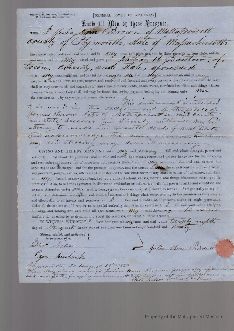 Nathan H. Barstow, power of attorney for Julia Ann Brown, settlement of the estate of James Snow.Collection