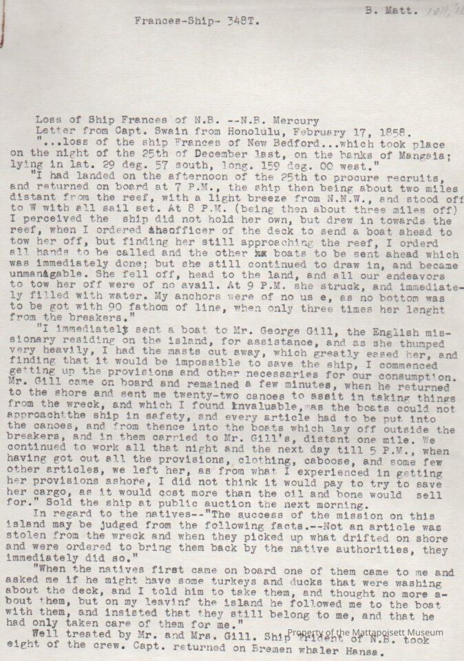 Letter from Capt. Wm. Swain about loss of Ship "Frances" of New Bedford.Collection