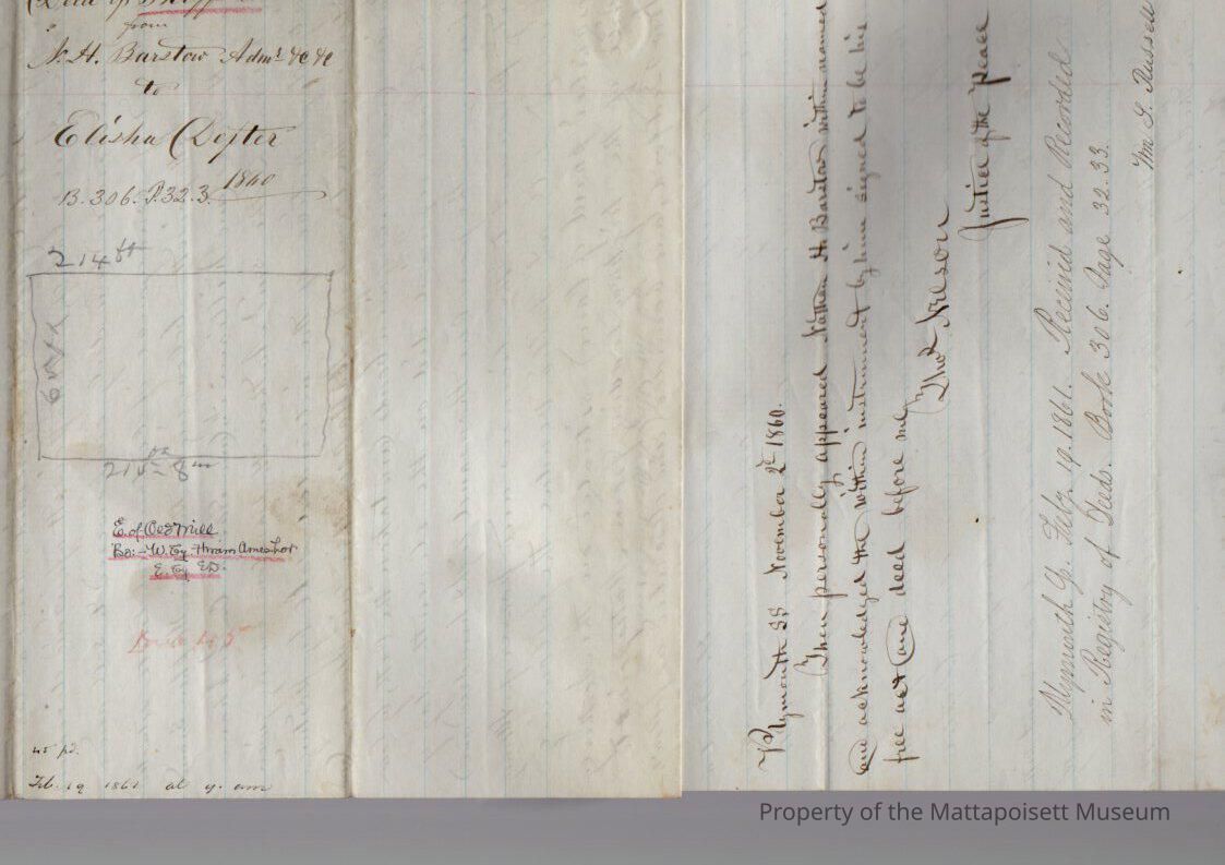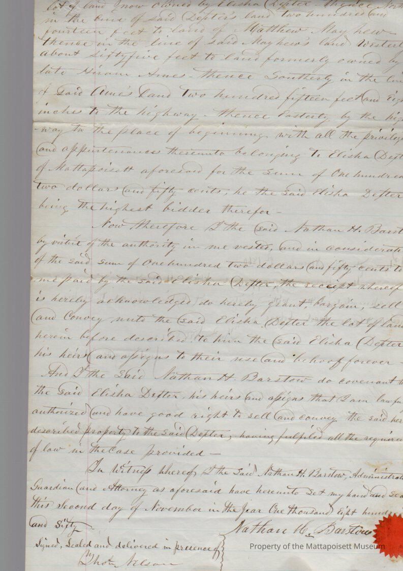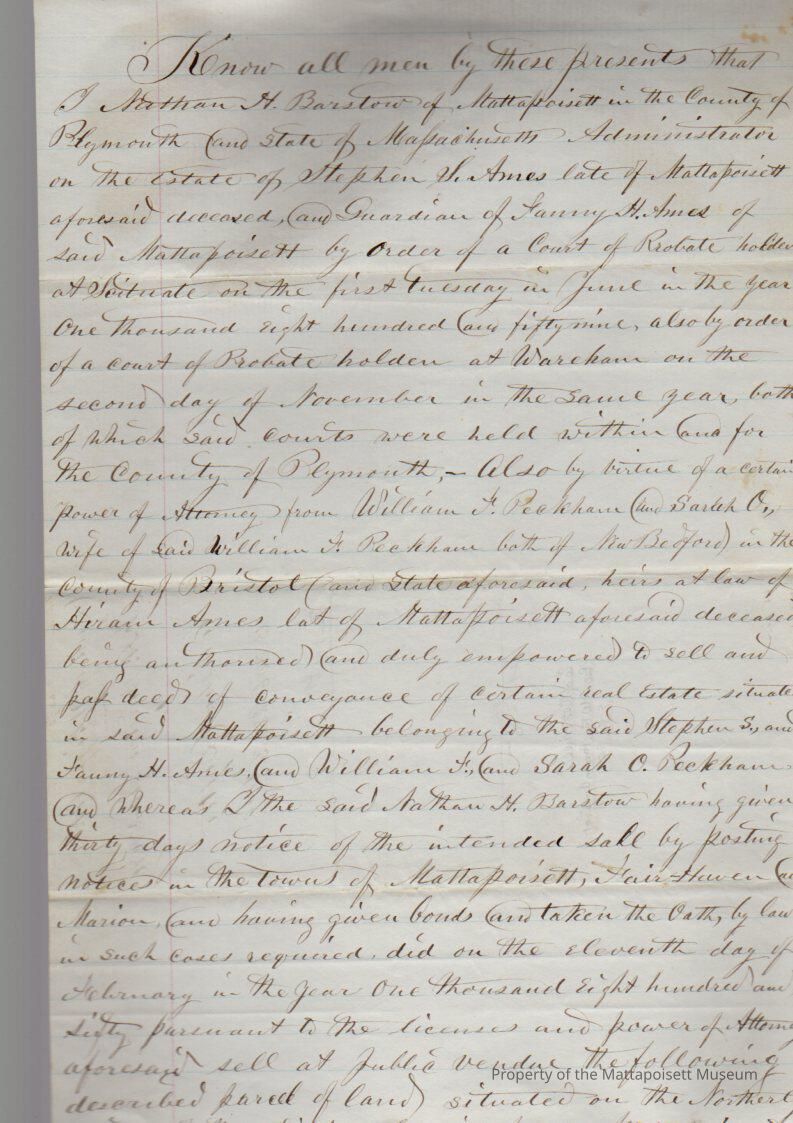 Nathan H. Barstow, administrator of the estate of Stephen S. Ames and guardian of Fanny H. Ames, power of attorney to William F. & Sarah O. Peckham, heirs of Hiram Ames, empowered to sell real estate by auction to Elisha Dexter for $102.50.Collection