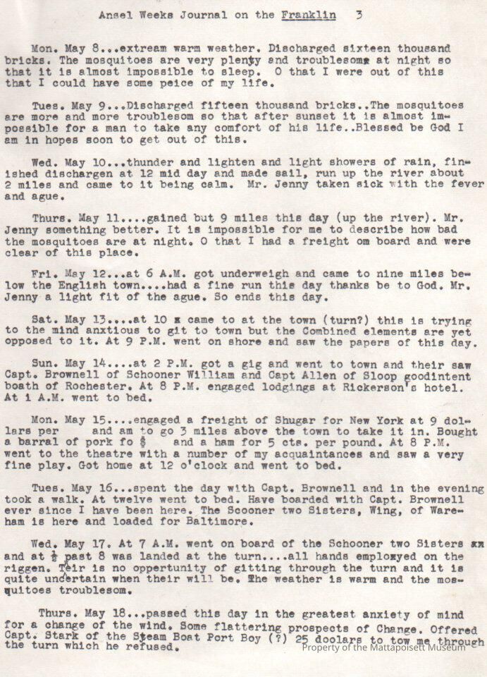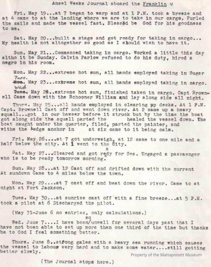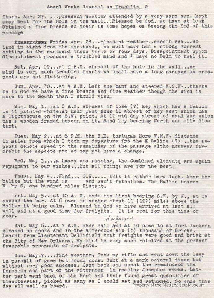 Journal kept by Ansel Weeks, Master of the Schooner Franklin owned by Leonard Hammond of Mattapiosett, on a voyage from new York to New Orleans. From April 15, 1826-June 8, 1826. Four typed pages.Collection