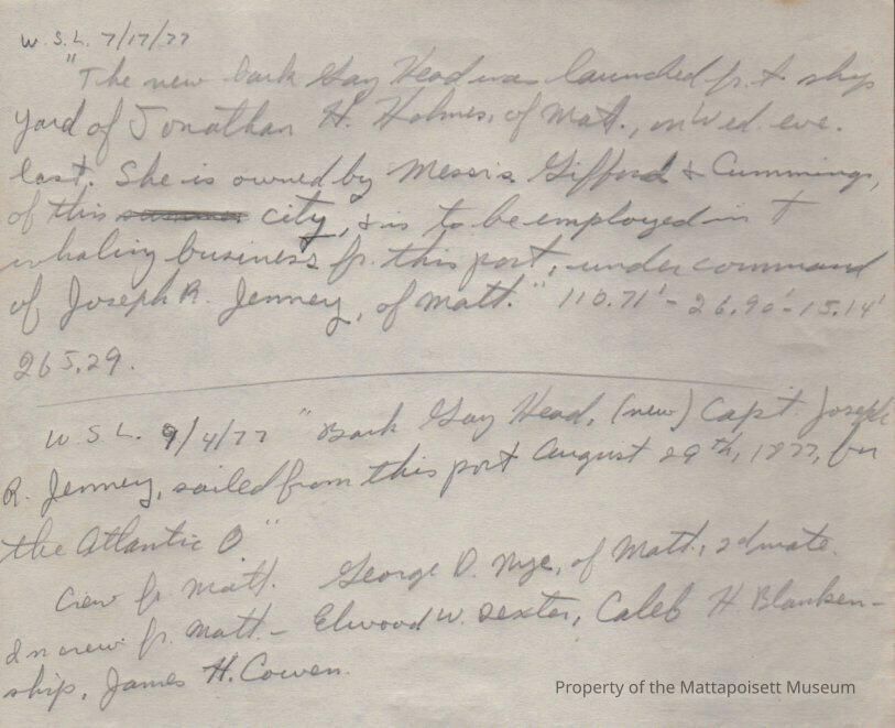 Three articles from Whalemens' Shipping List about the Bark "Gay Head" and Marcus B. LeBaron. July 17, 1877: http://library.mysticseaport.org/Images/wsl/18770717.pdf, September 4, 1877: http://library.mysticseaport.org/Images/wsl/18770904.pdf and August 14, 1877: http://library.mysticseaport.org/Images/wsl/18770814.pdfCollection