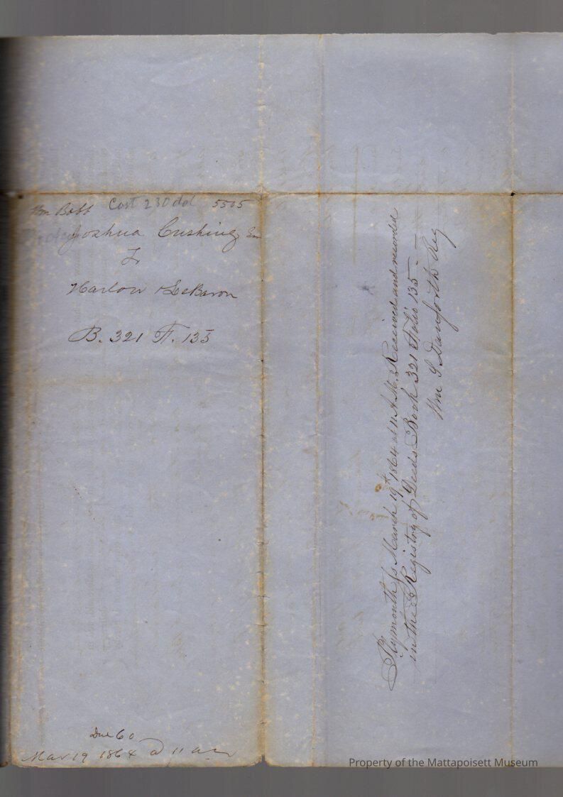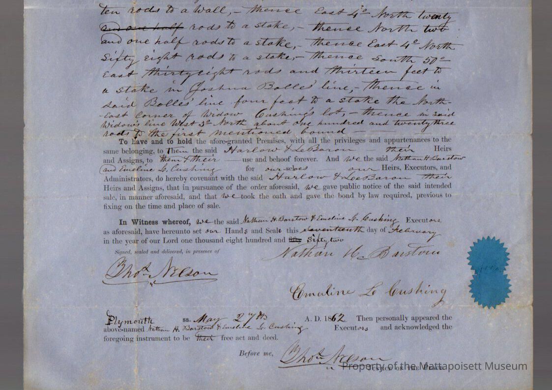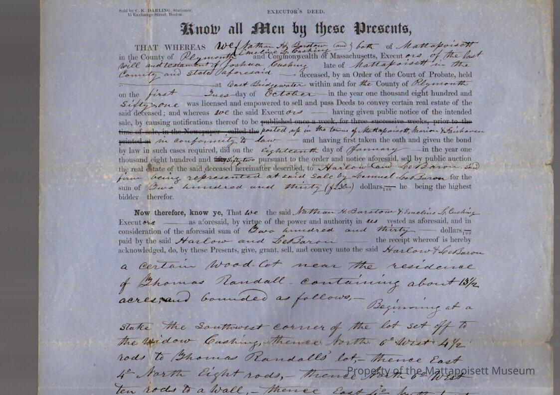 Nathan H. Barstow & Emeline L. Cushing, executors of the will of Joshua Cushing to Harlow & LeBaron (Abner Harlow & Lemuel LeBaron), 13 ½ acres of woodland for $230.Collection
