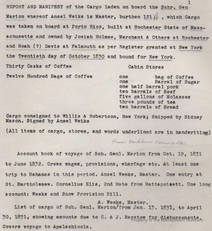 Report and manifest of the cargo laden on board the Schooner General Marion. Account book of voyage of Schooner General Marion from October 19, 1831 to June 1832. Ansel Weeks, master.Collection