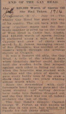 Newspaper clipping: End of the Gay Head, also of $20,000 worth of sperm oil she had taken. June 1914. "Vancouver, B. C., July 19 - The whaler "Gay Head" has gone the way of its quarry. The old bark with the snug to'gallant masts and the Bermuda spanker is piled up on the rocks of West Head in Castle Bay, Alaska and $20,000 worth of sperm boiling is slathered along a mile of foam. Captain and cre of thirty were saved. L. E. James, Managing owner of San Franscisco was notified of the vessel's wreck through the wireless station at Chignik."Collection