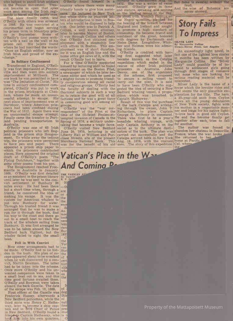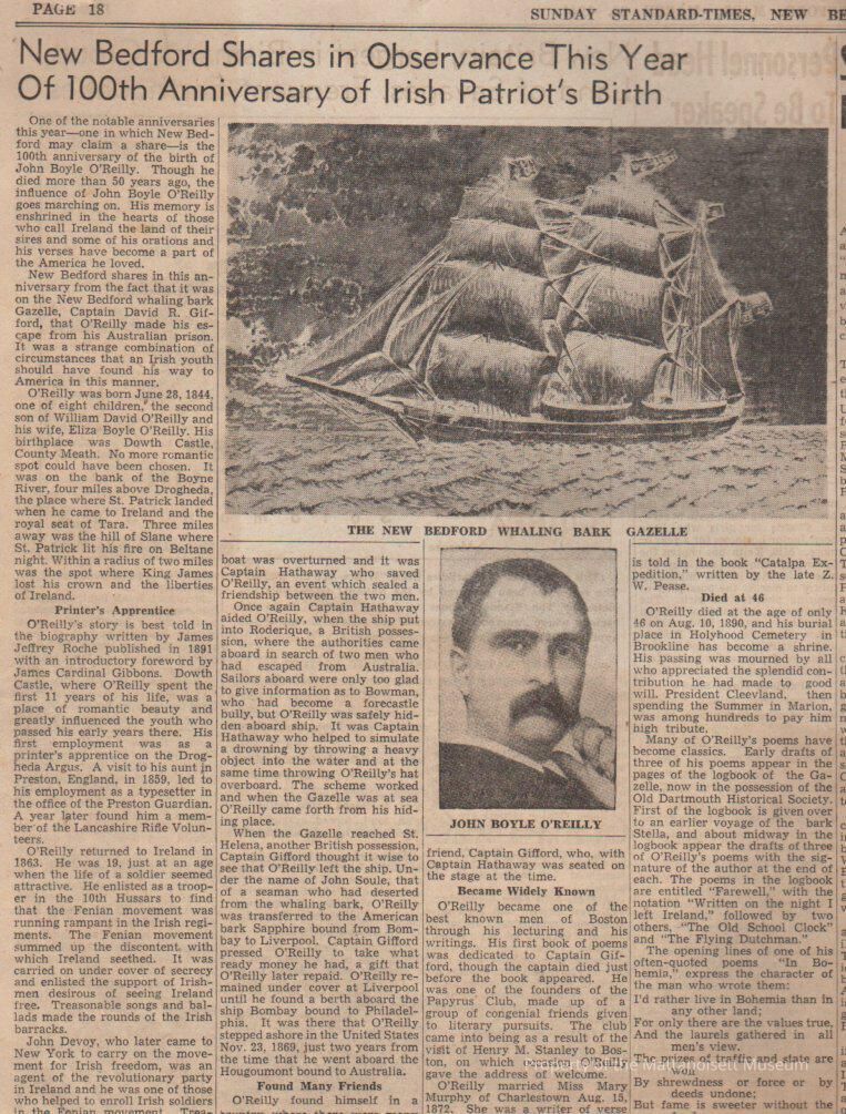New Bedford Shares in Ovservance This Year of 100th Anniversary of Irish Patriot's Birth. John Boyle O'Reilly. Irish-born poet, artist and fiction writer, came to America aboard whaling Bark "Gazelle" from Austrailian prison.Collection