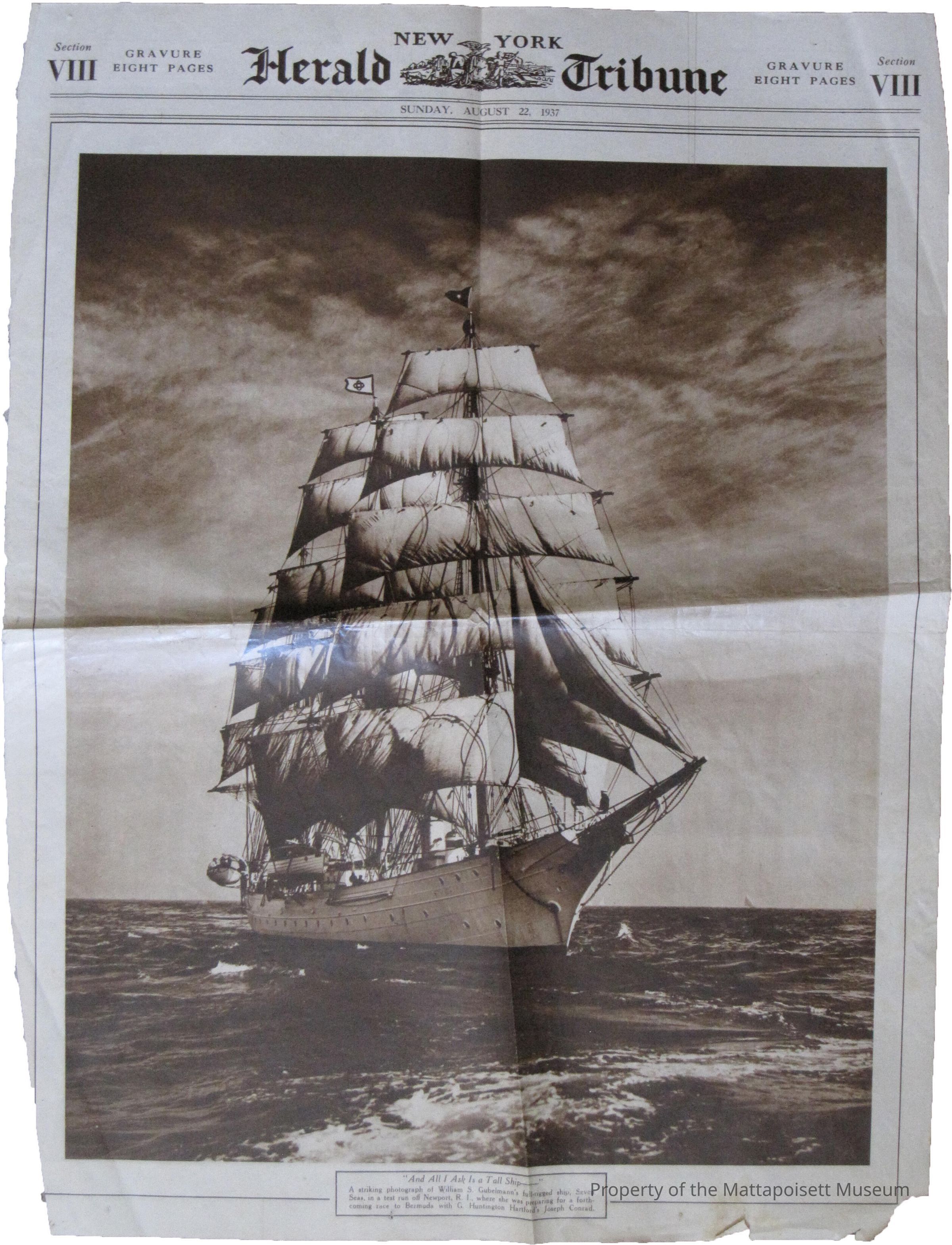 Photograph from the New York Herald Tribune, Sunday, August 22, 1937. "And all I ask is a Tall Ship" A striking photograph of William S. Gubelmann's gull-rigged ship, "Seven Seas", in a test run off Newport, RI, where she was preparing for a forth-coming race to Bermuda with G. Huntington Hartford's "Joseph Conrad".Collection