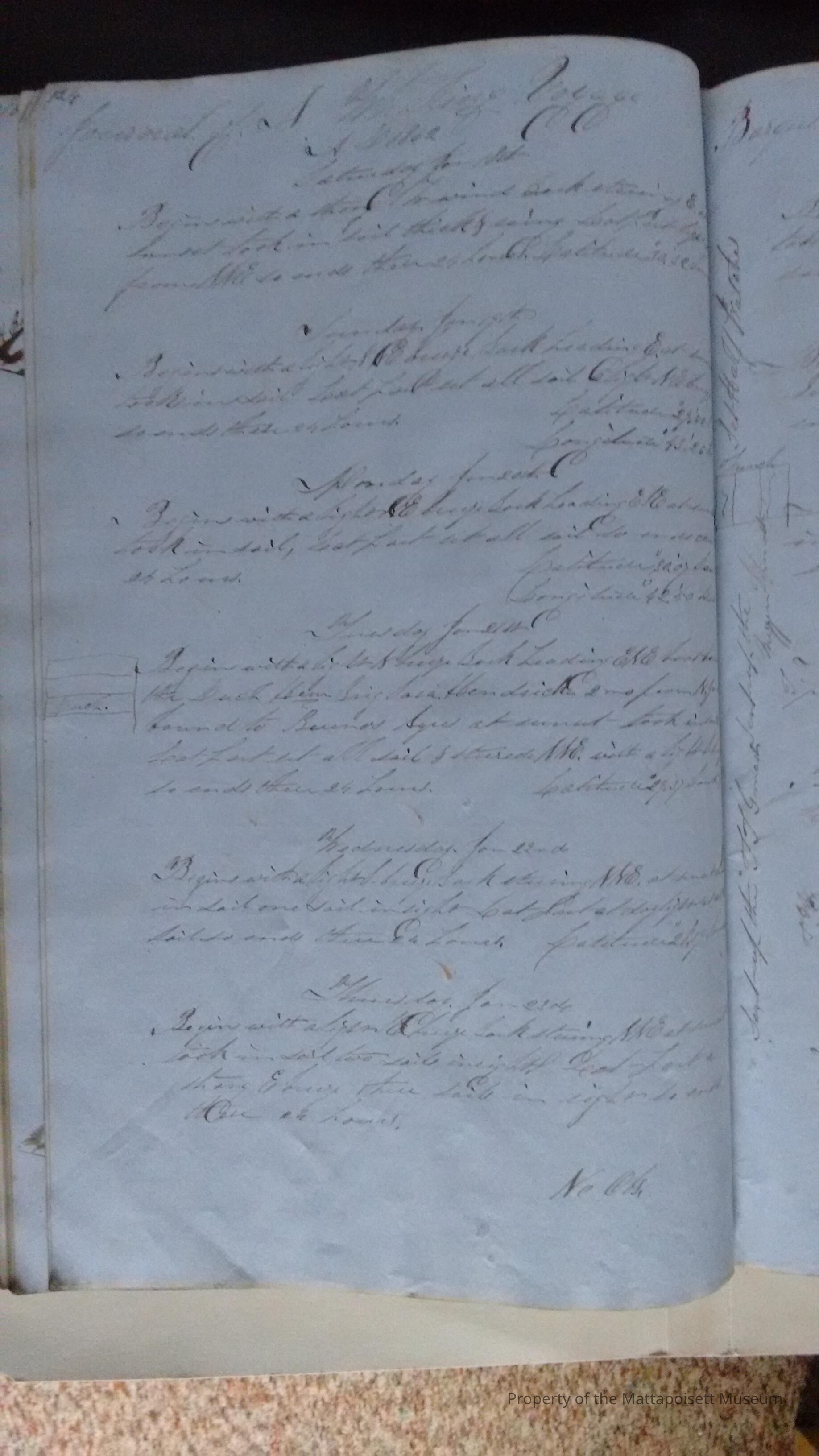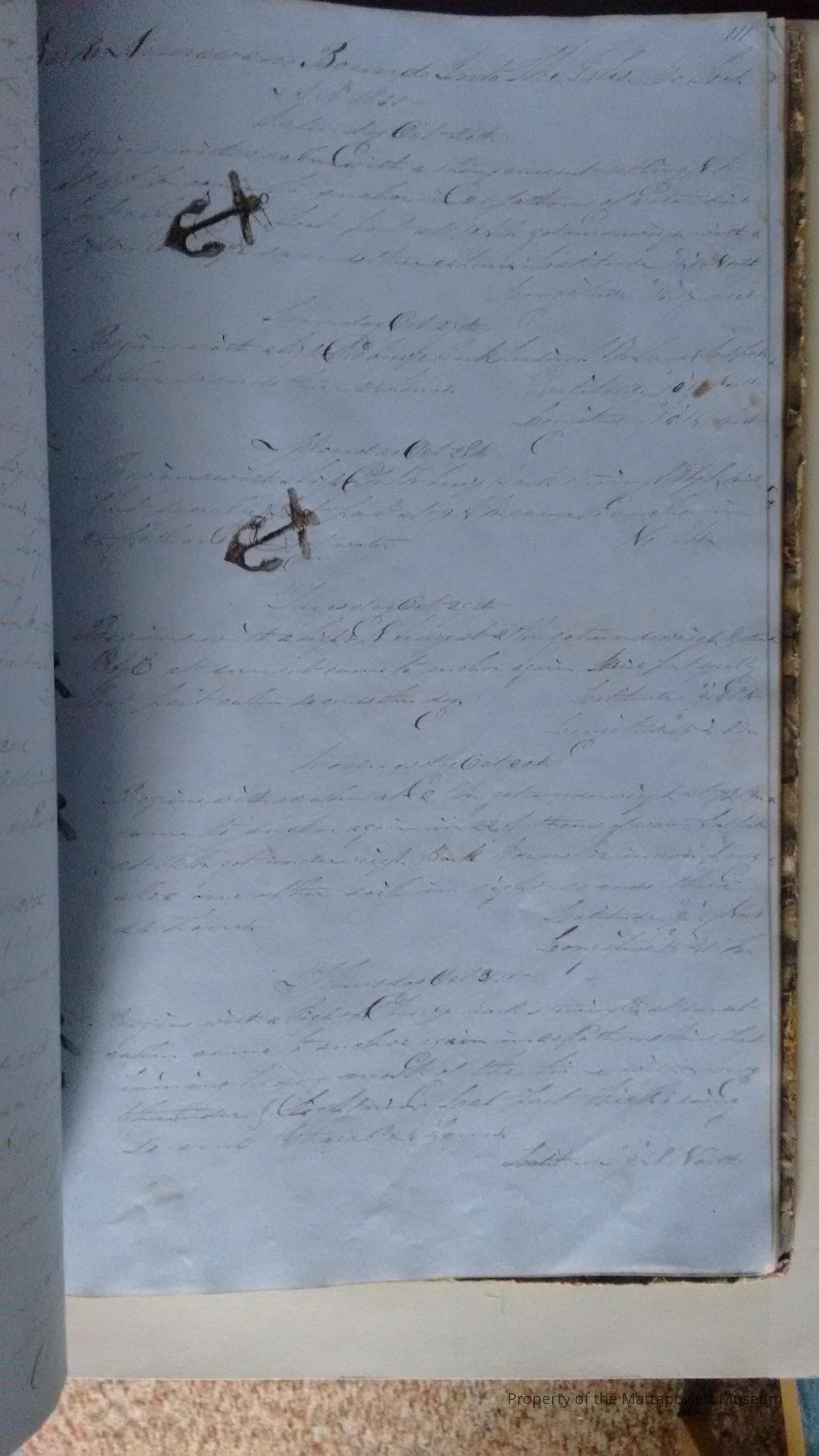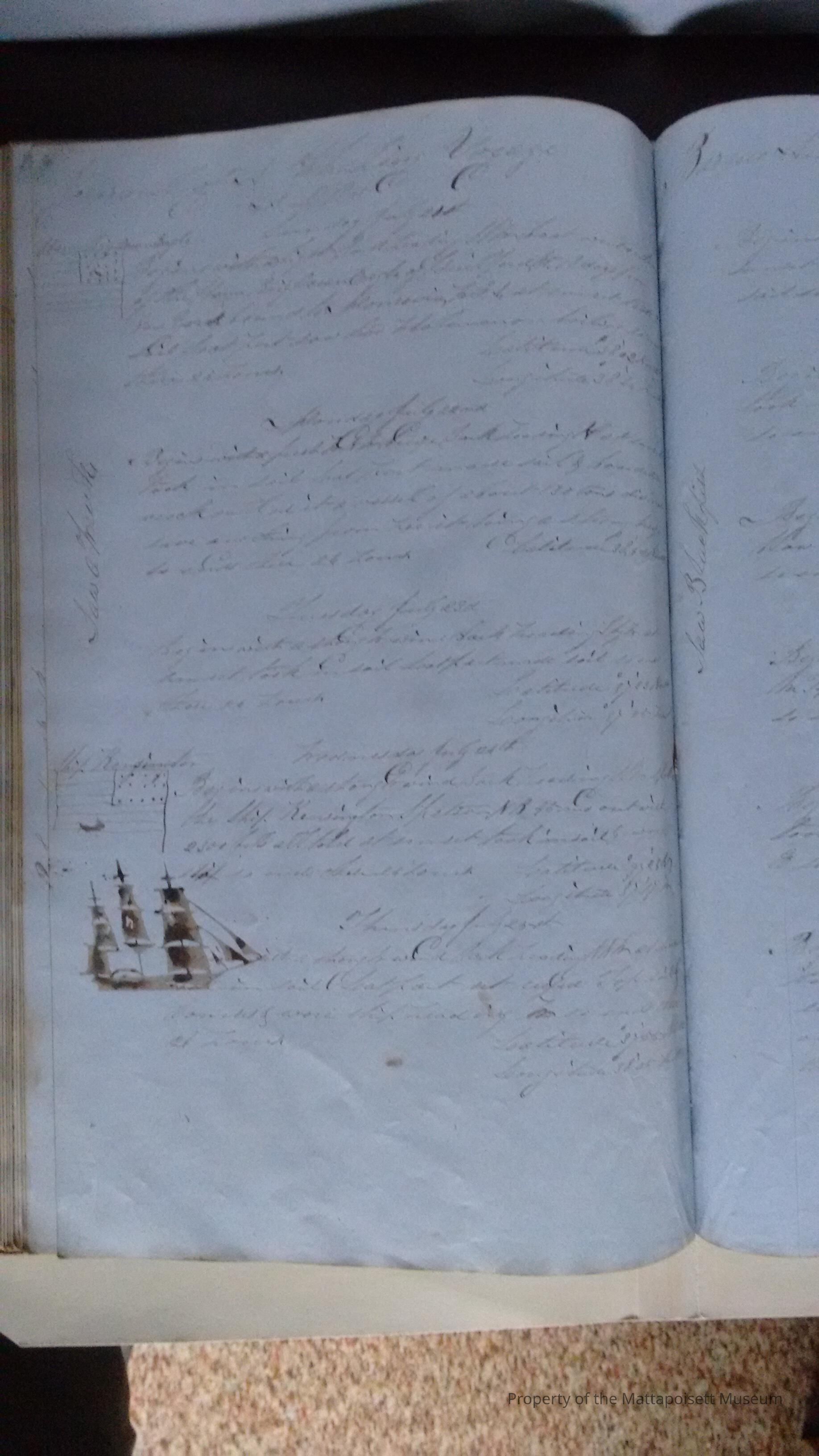 Log book of Bark Annawan, voyage from November 1859 to June 1862. Whale, ship and anchor stamps. Some of the writing has faded.Acquisition