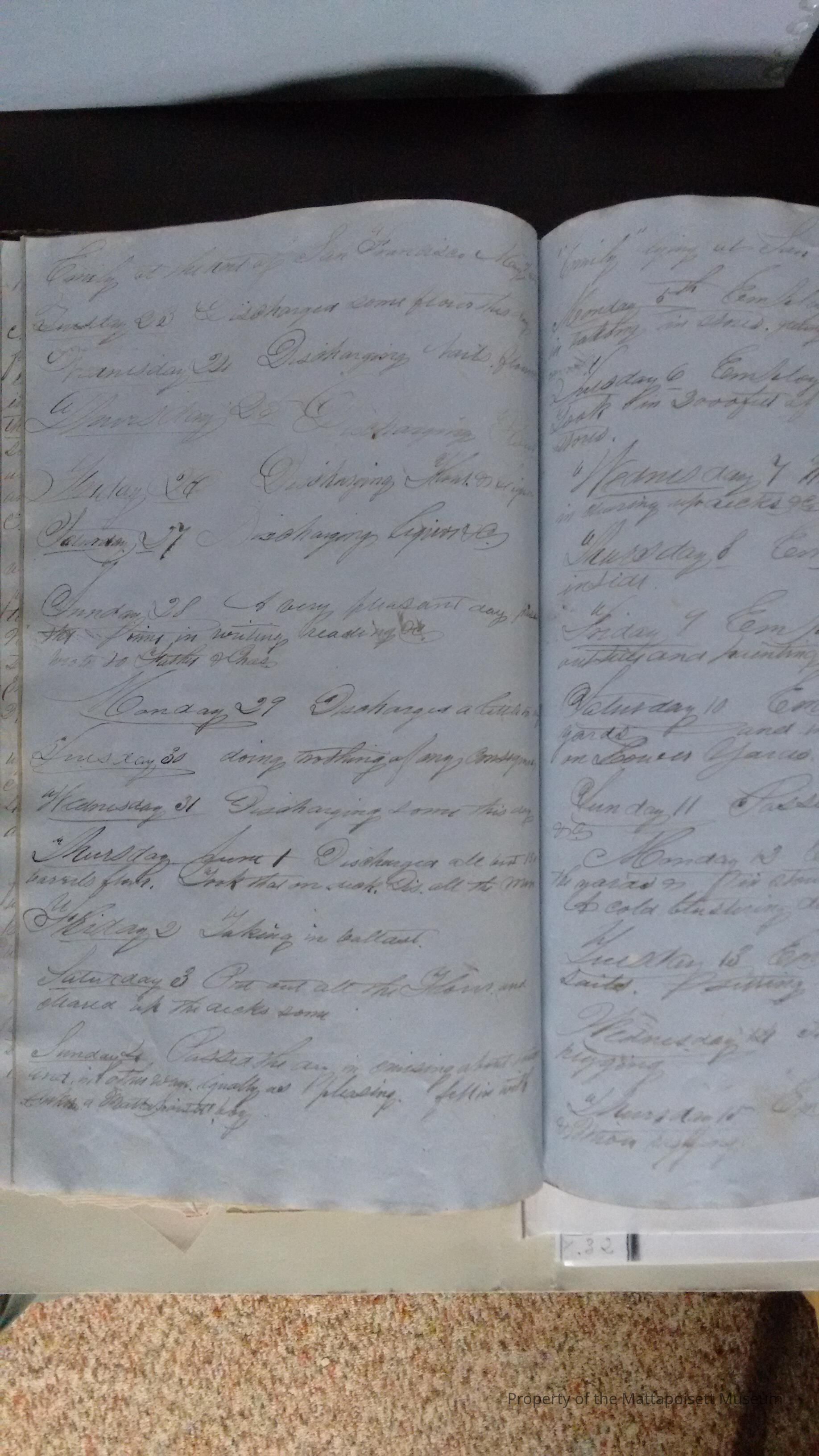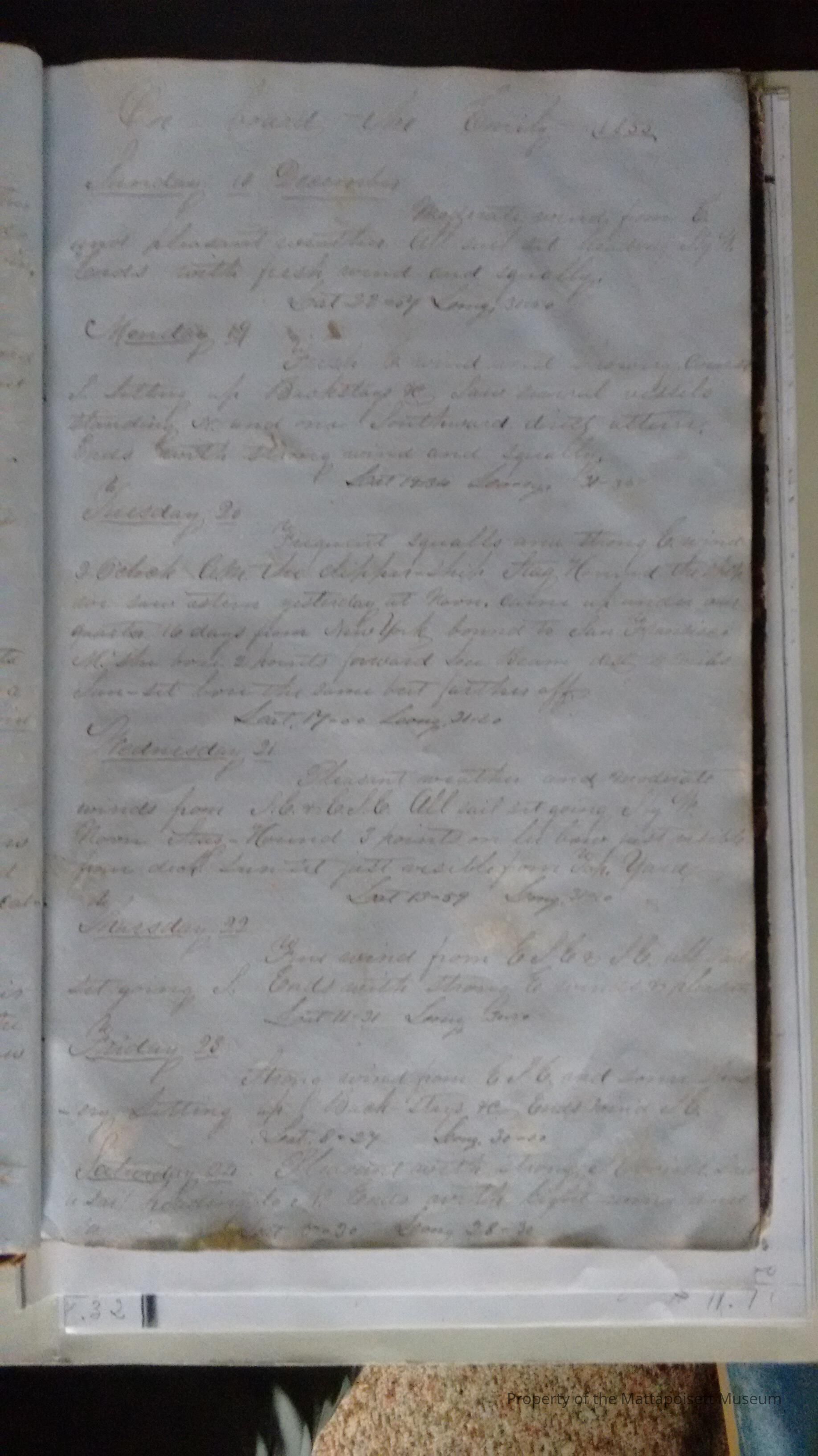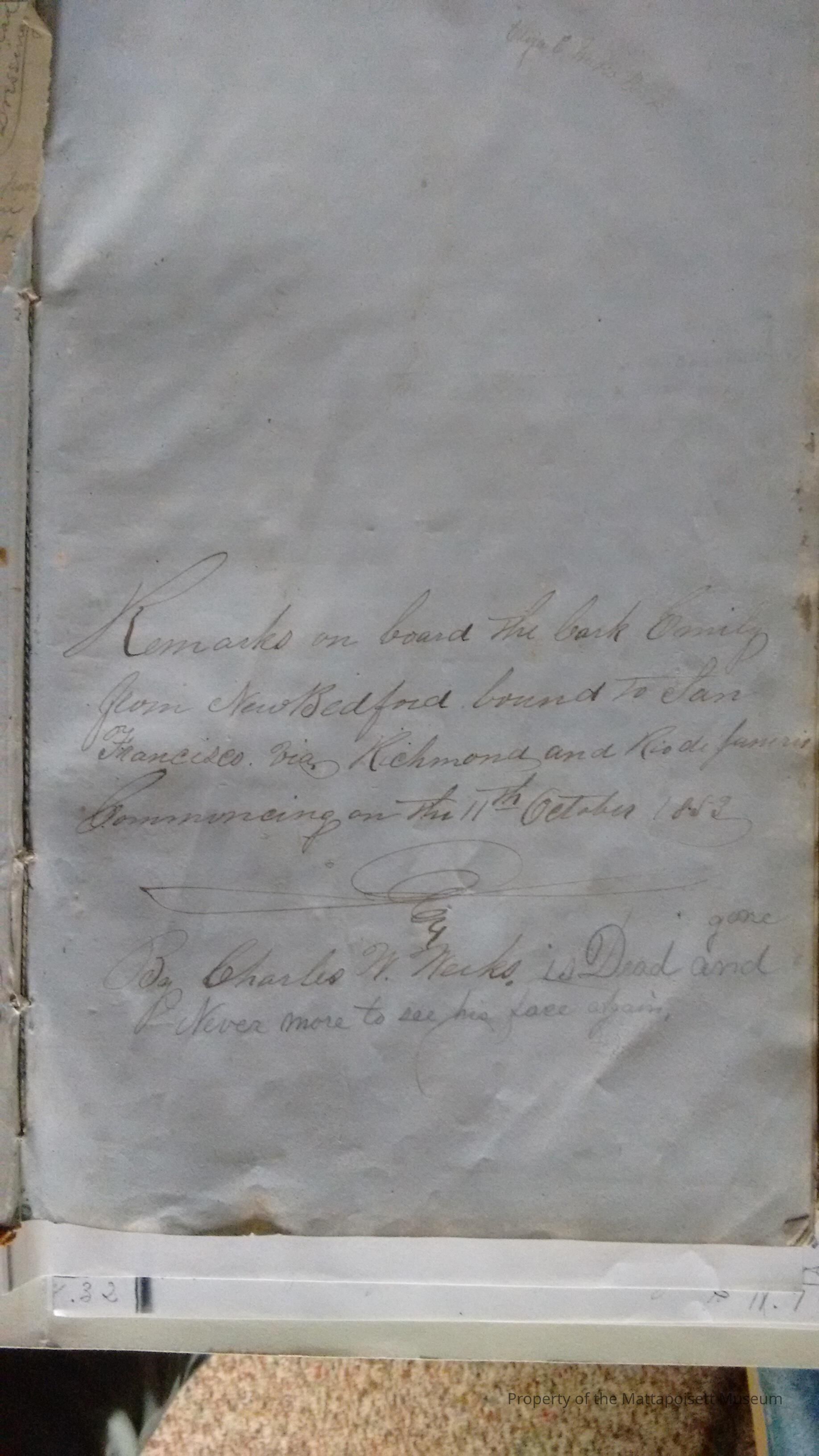 Log book of Bark Emily. "Remarks on board the bark Emily from New Bedford bound to San Francisco viz. Richmond and Rio de Janerio. Commencing on the 11th of October 1853", Charles W. Weeks, master? The first few pages were used as a scrapbook with newspaper clippings of articles relating to household suggestions and recipes.Acquisition