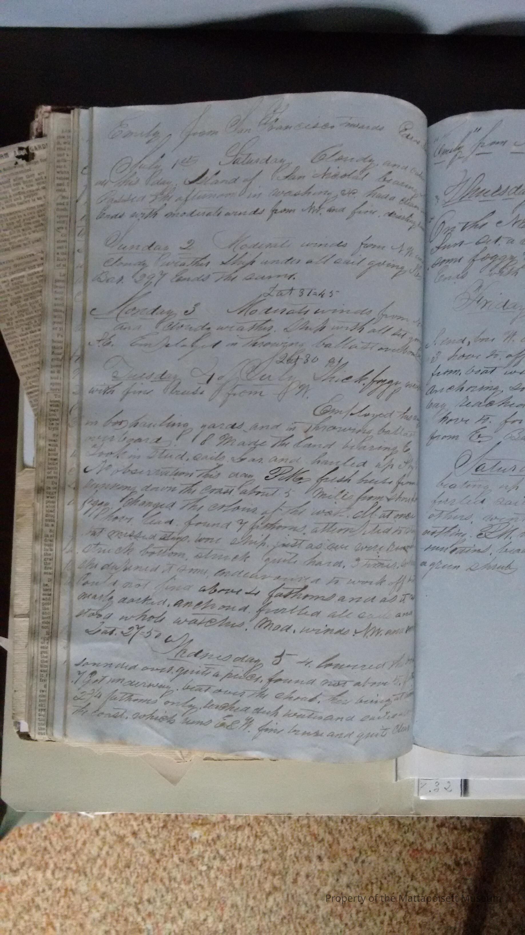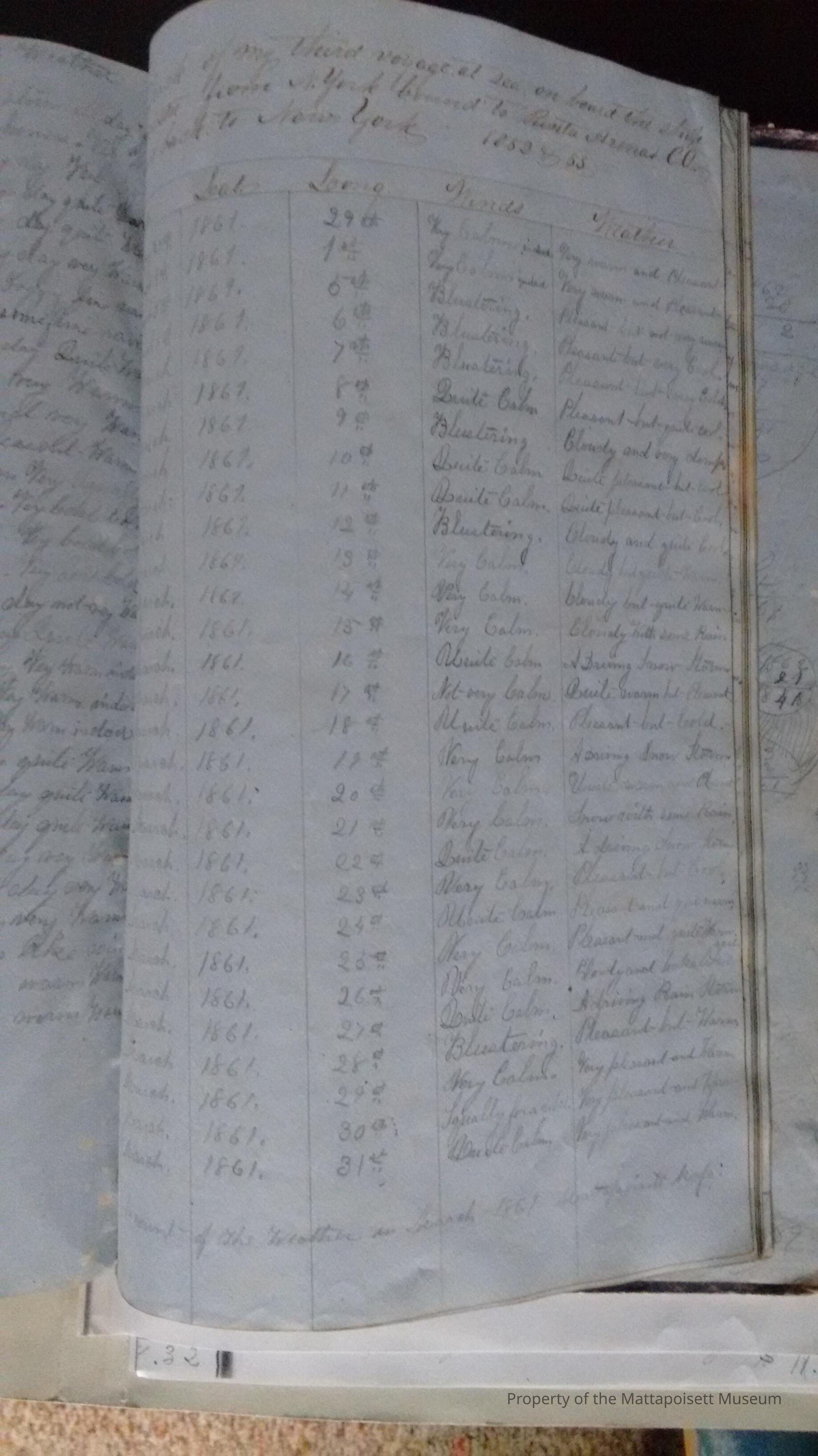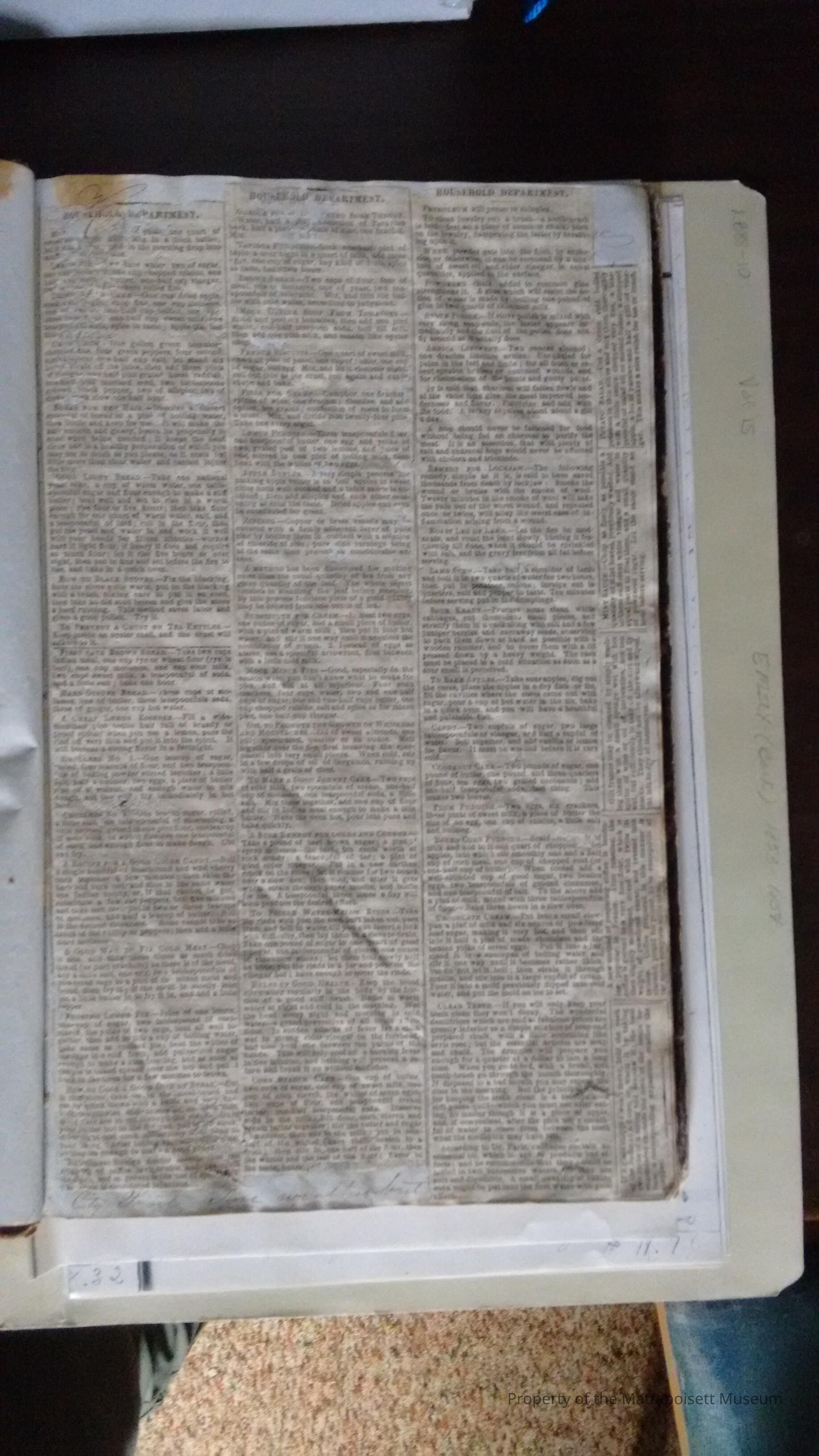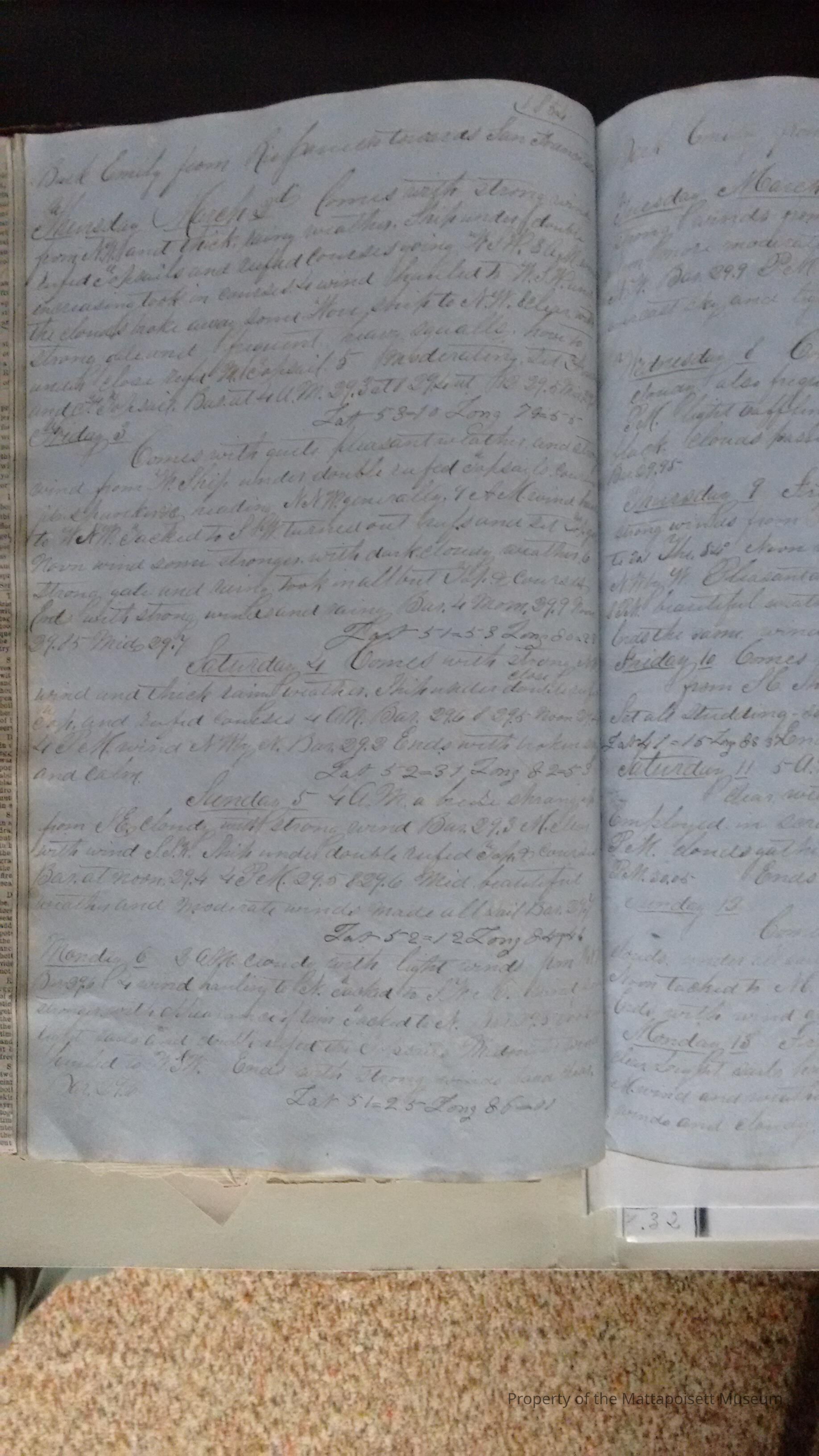 Log book of Bark Emily. "Remarks on board the bark Emily from New Bedford bound to San Francisco viz. Richmond and Rio de Janerio. Commencing on the 11th of October 1853", Charles W. Weeks, master? The first few pages were used as a scrapbook with newspaper clippings of articles relating to household suggestions and recipes.Acquisition
