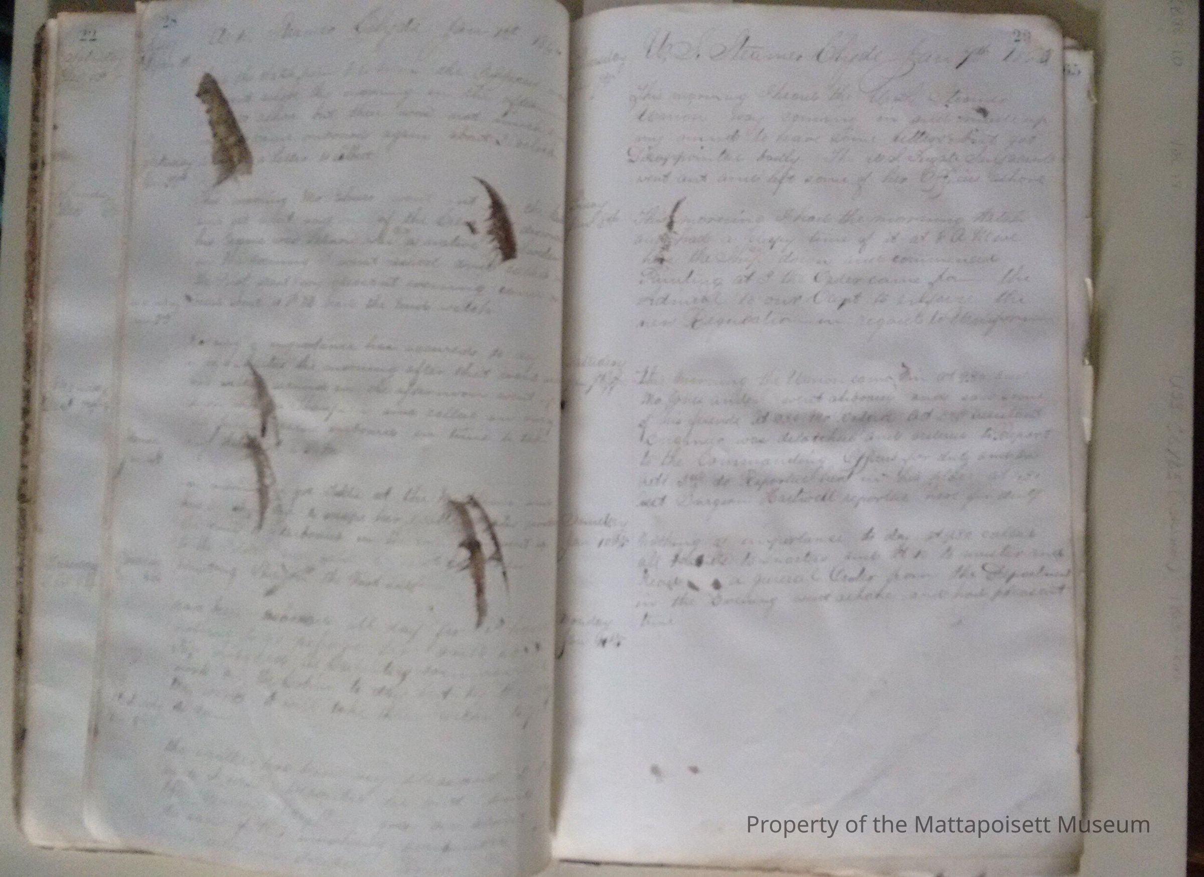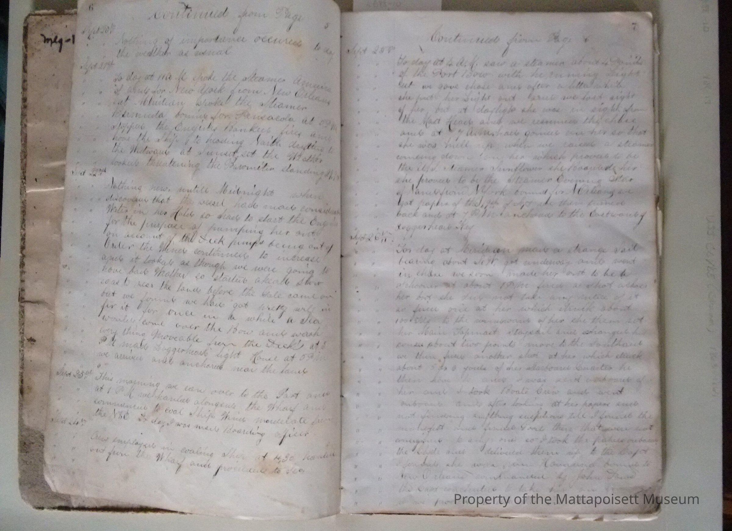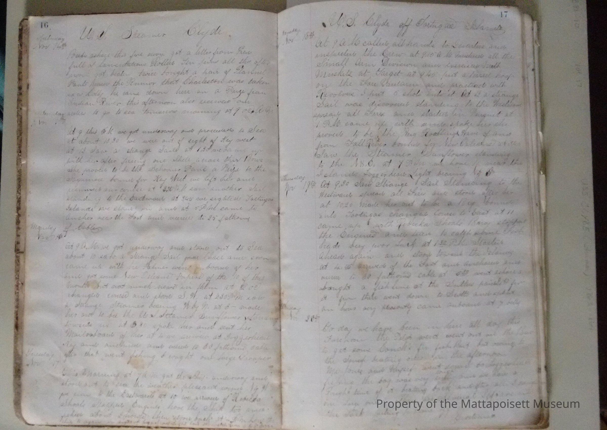 Log book of USS Clyde (steamer). Diary of George Dexter on board. Gift made by Gertrude Dexter. Section at the back on letters recieved and mailed.