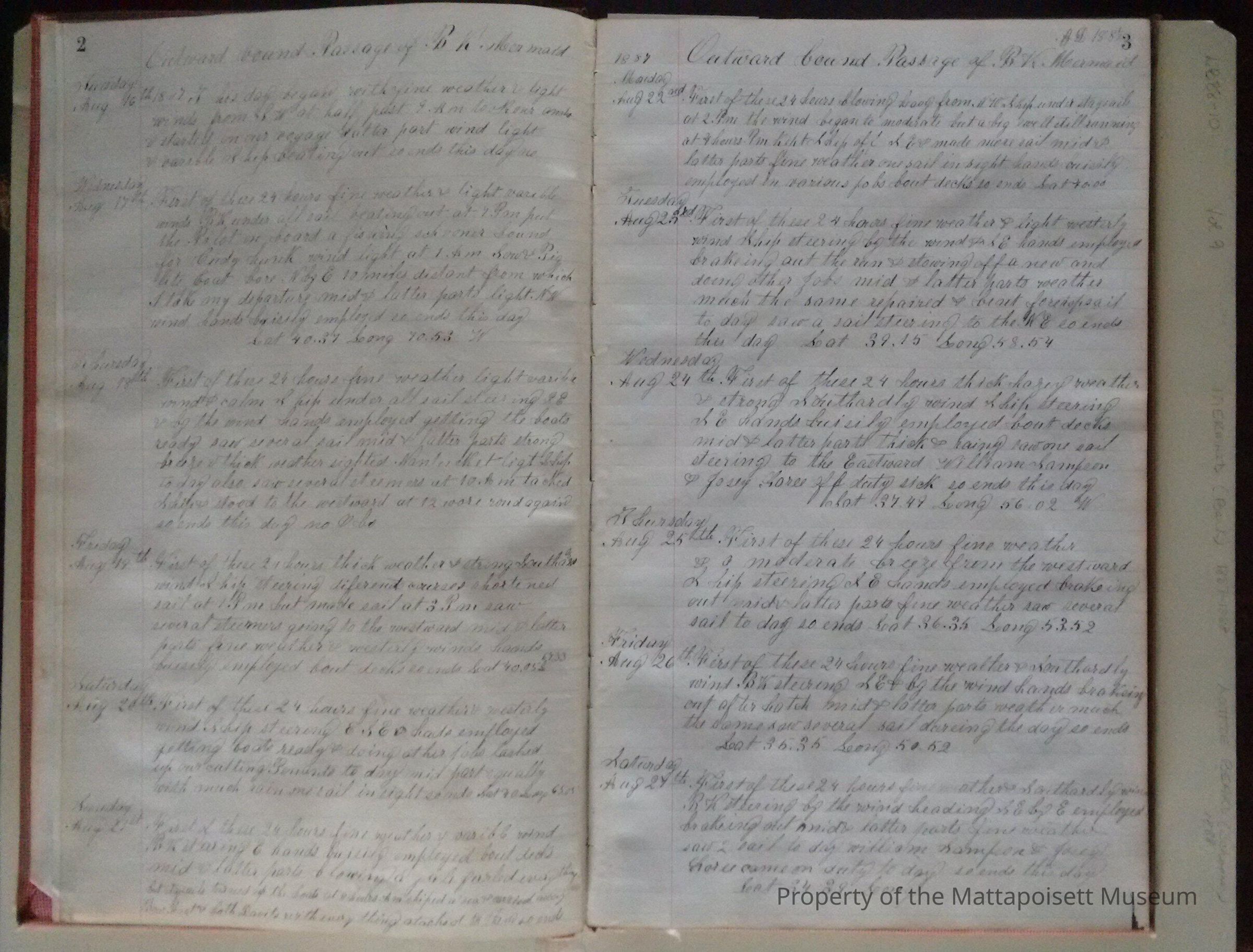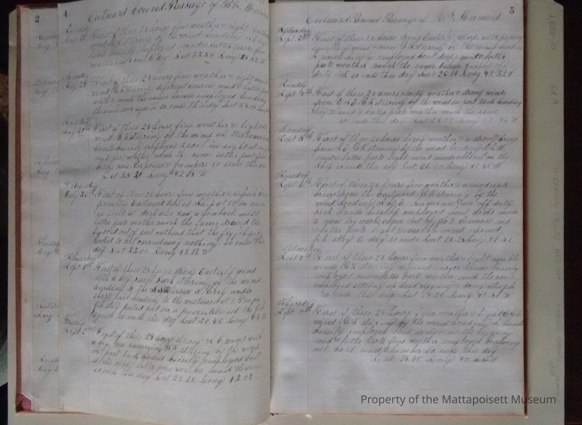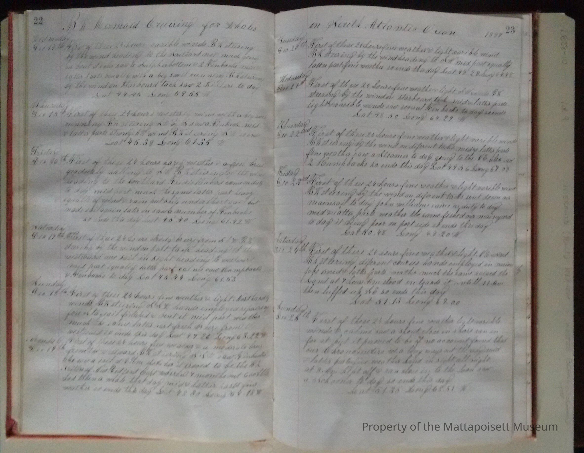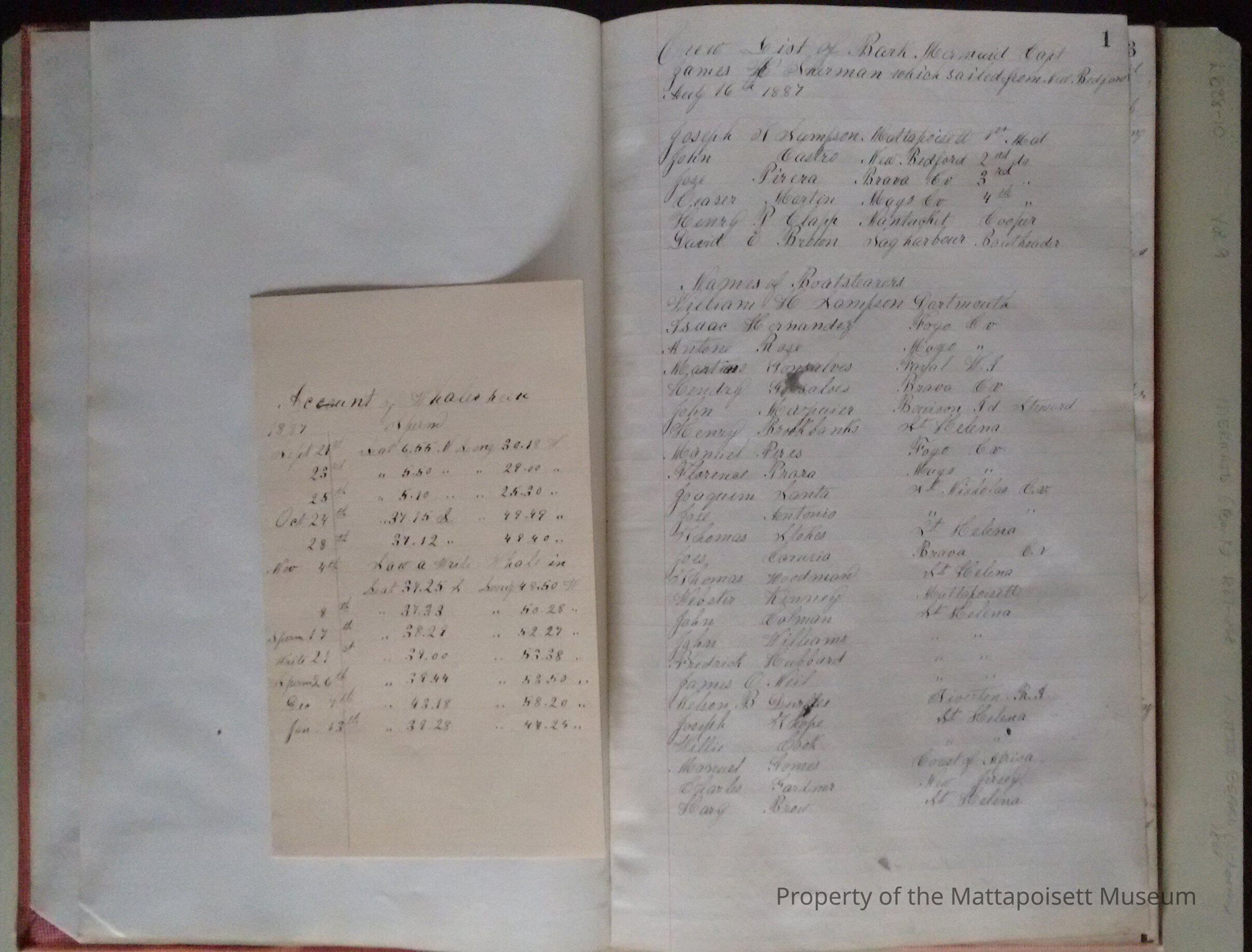 Log book of Bark Mermaid. Capt. James H. Sherman, sailed from New Bedford July 16th 1887. Crew list, list of whales seen. Blank from page 46 back.Acquisition