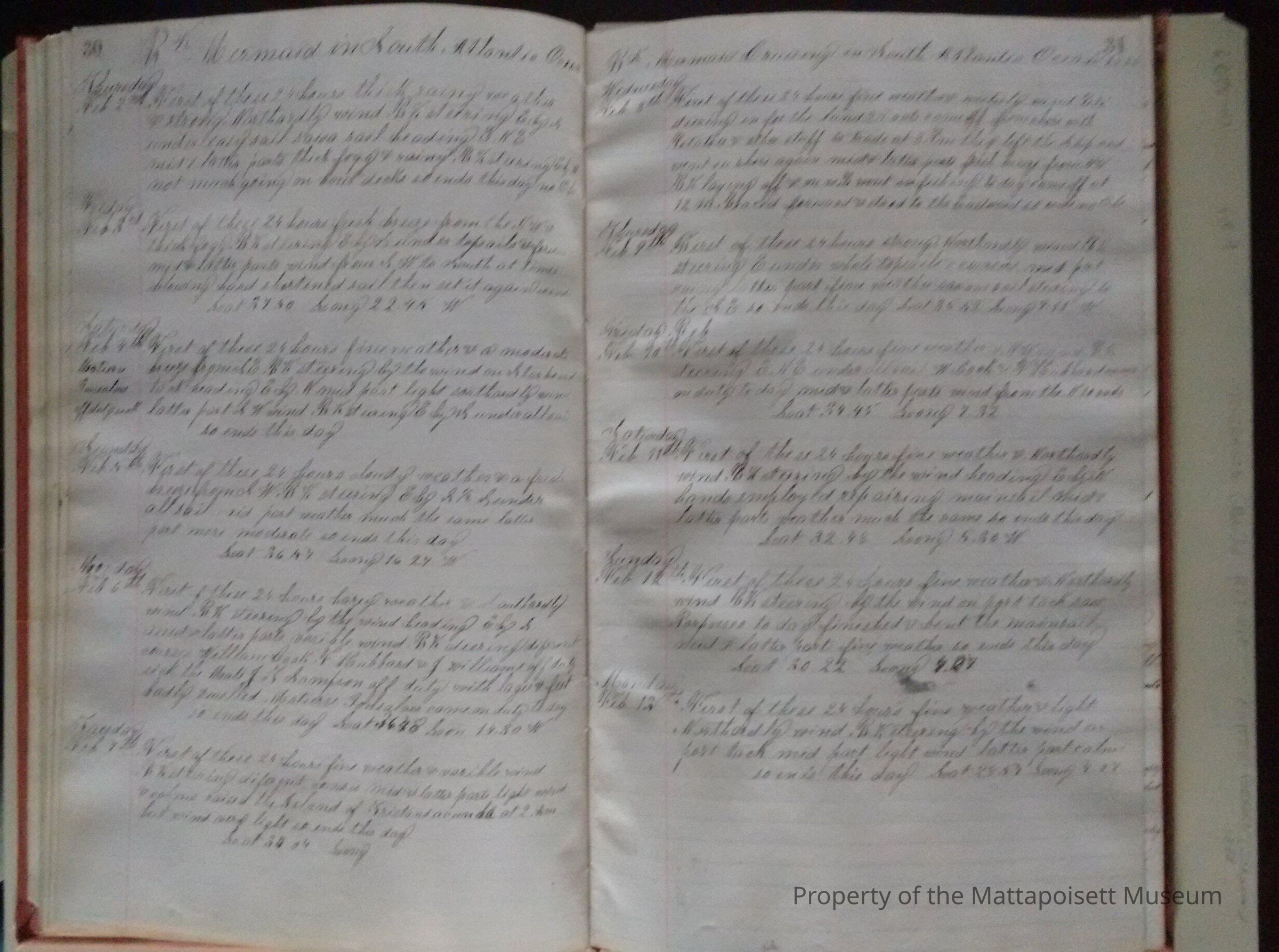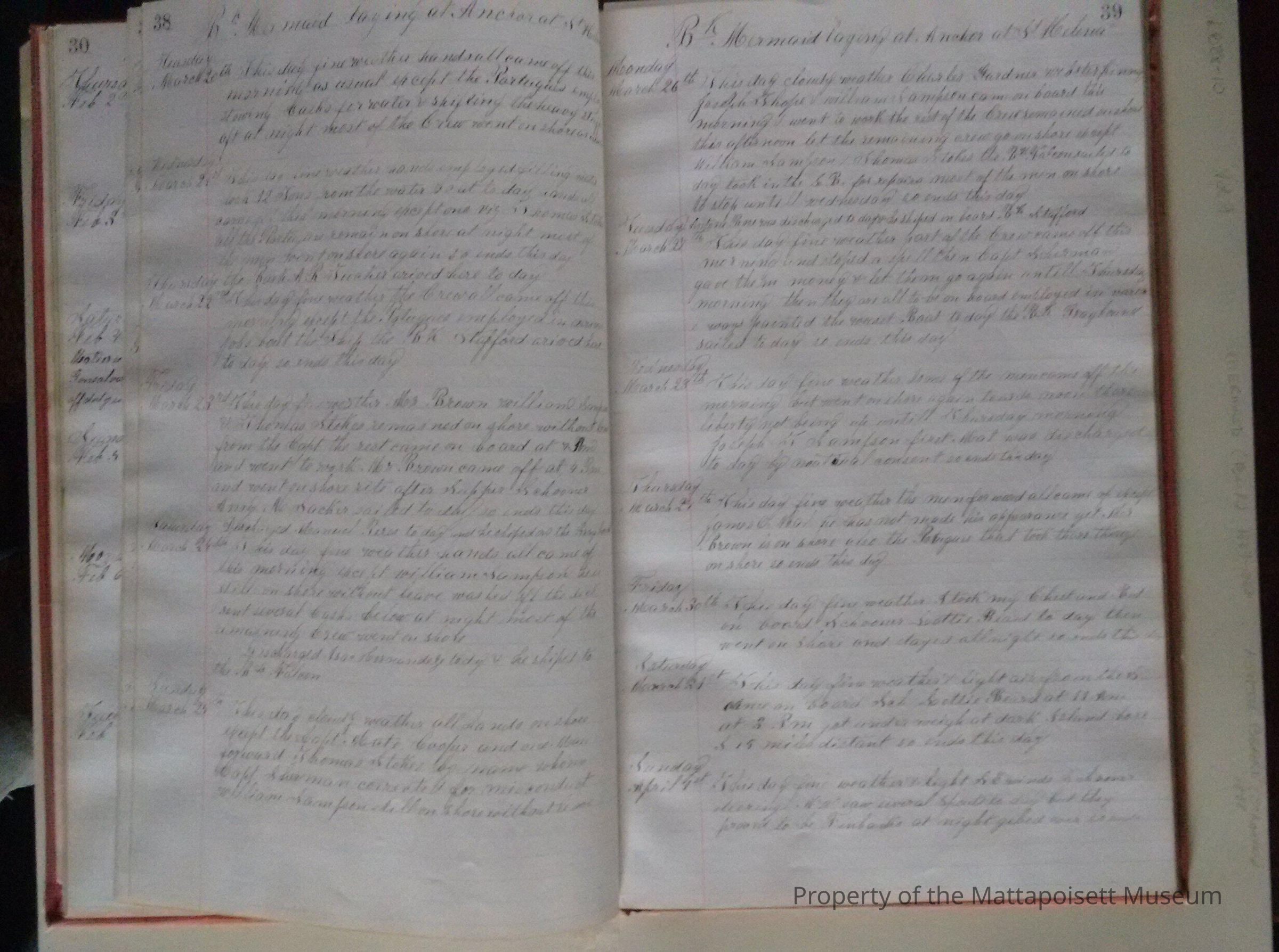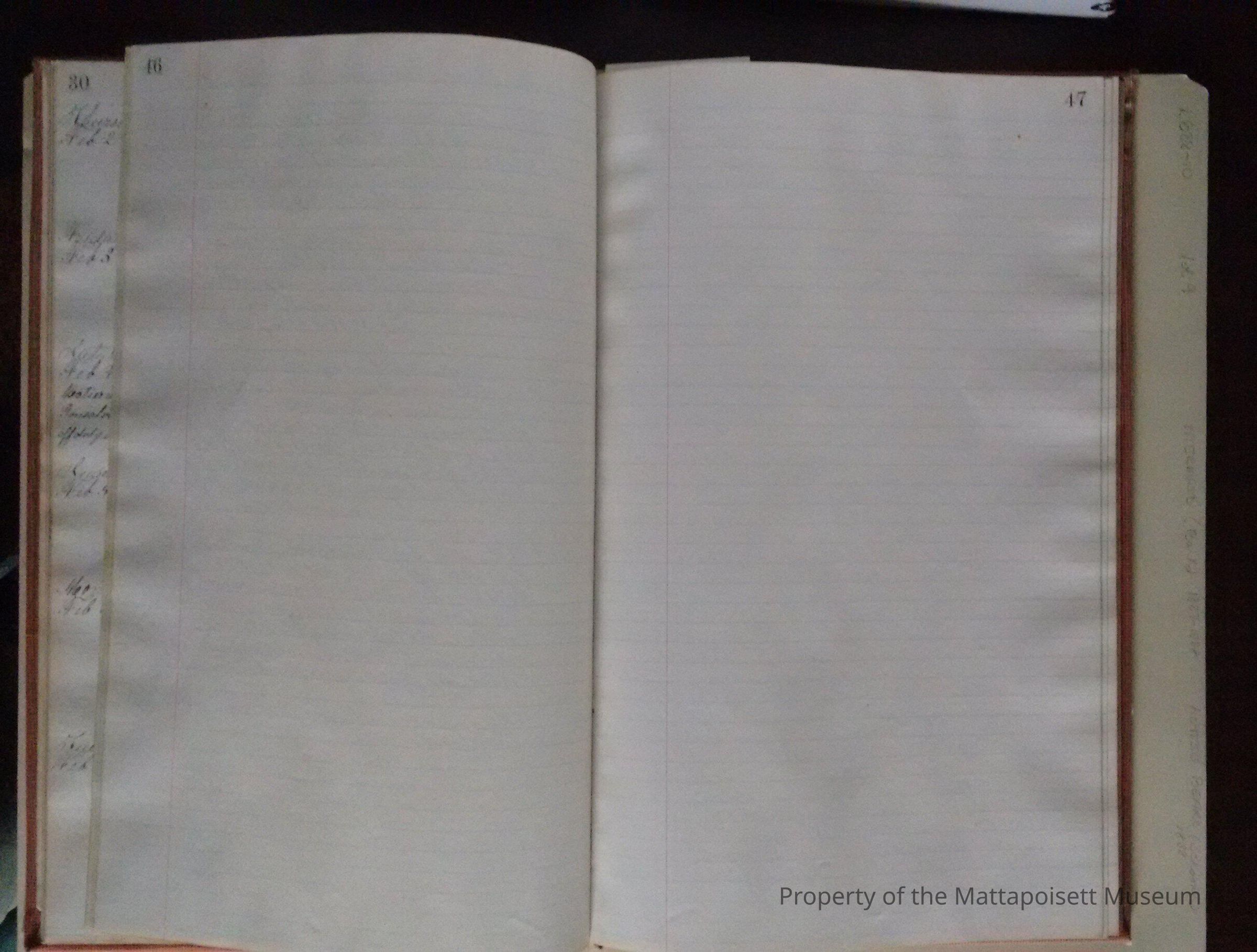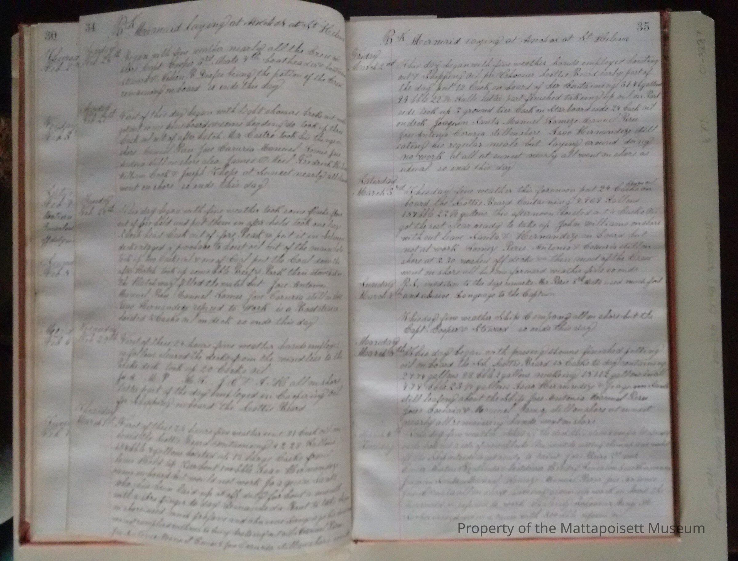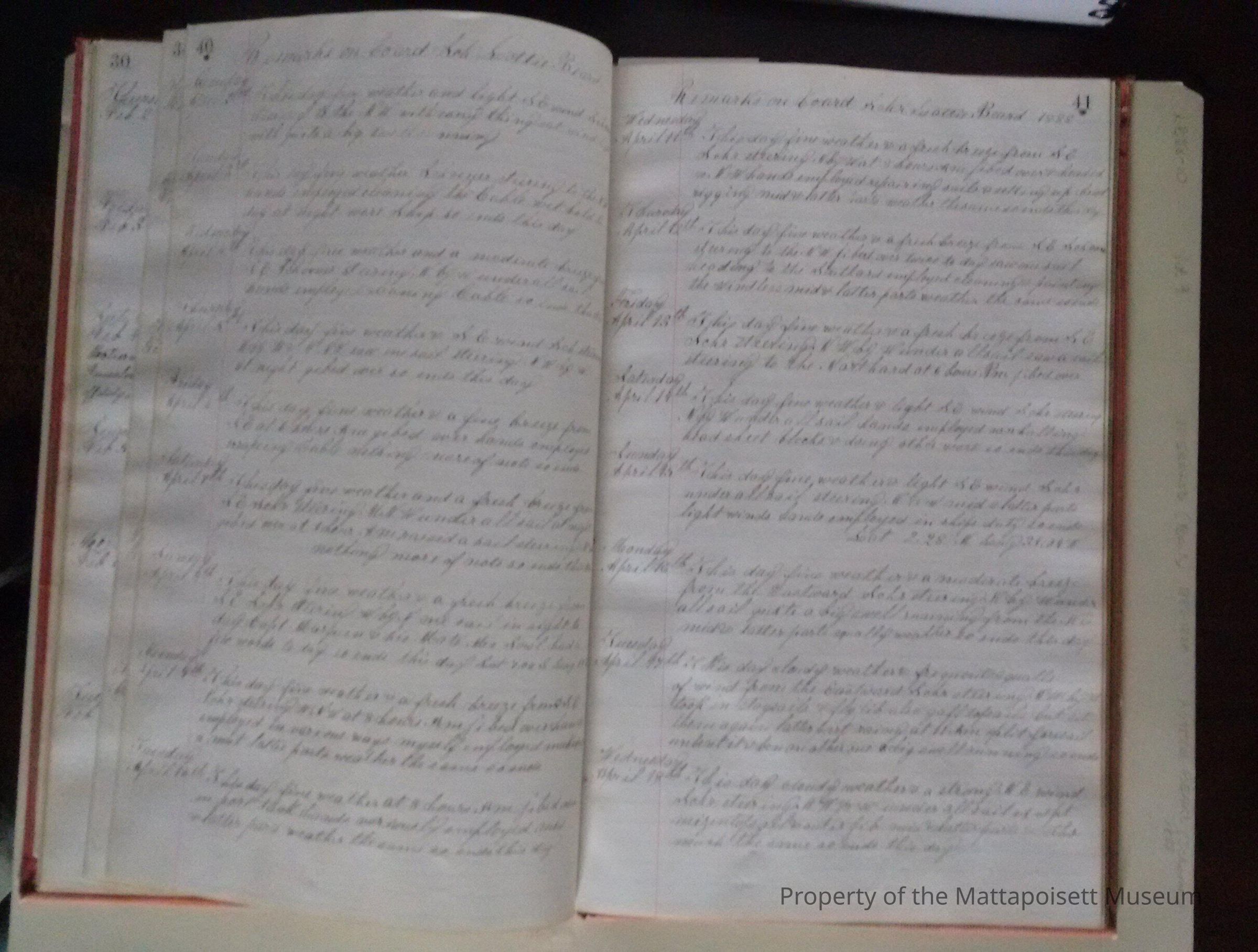Log book of Bark Mermaid. Capt. James H. Sherman, sailed from New Bedford July 16th 1887. Crew list, list of whales seen. Blank from page 46 back.Acquisition