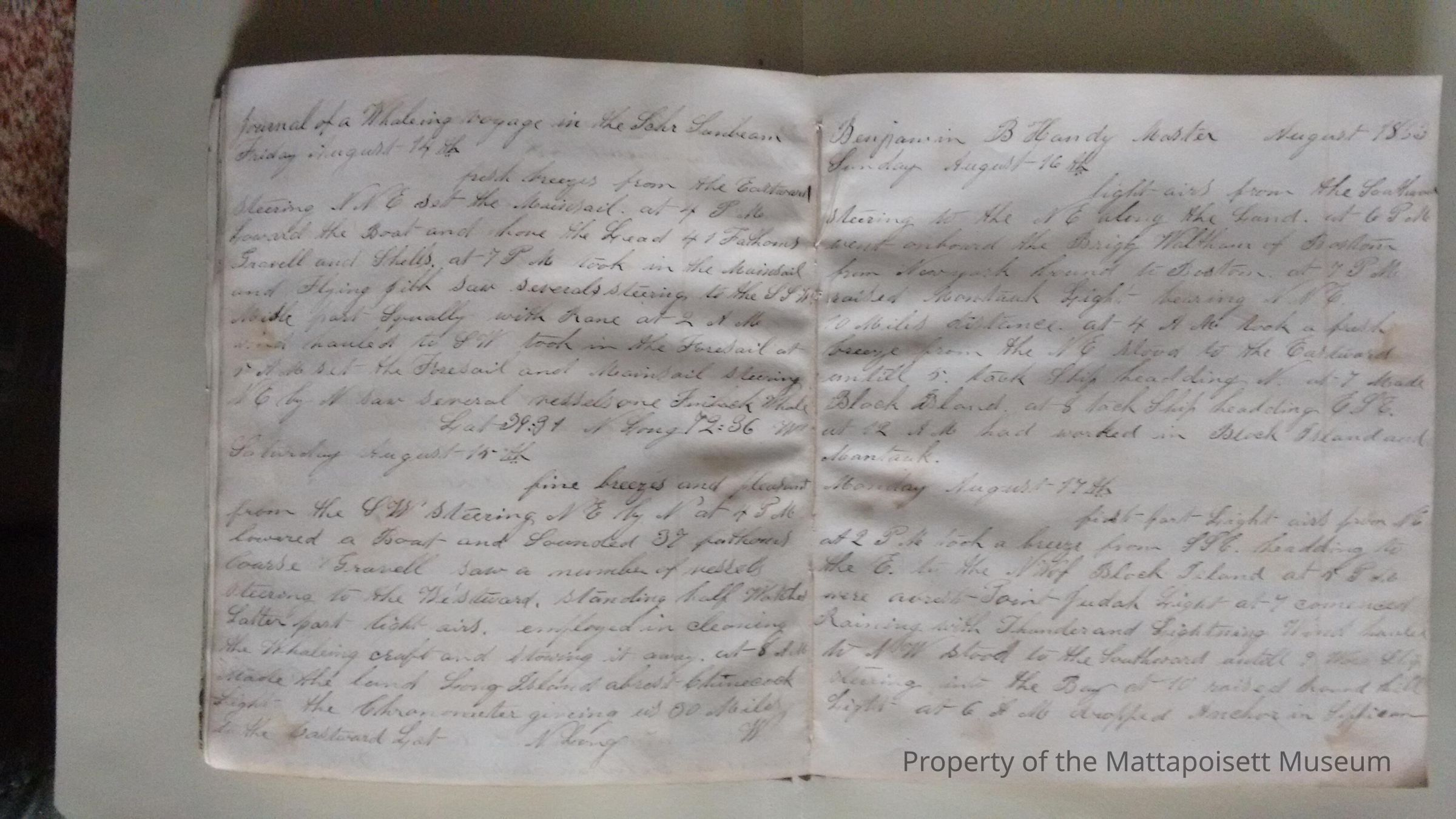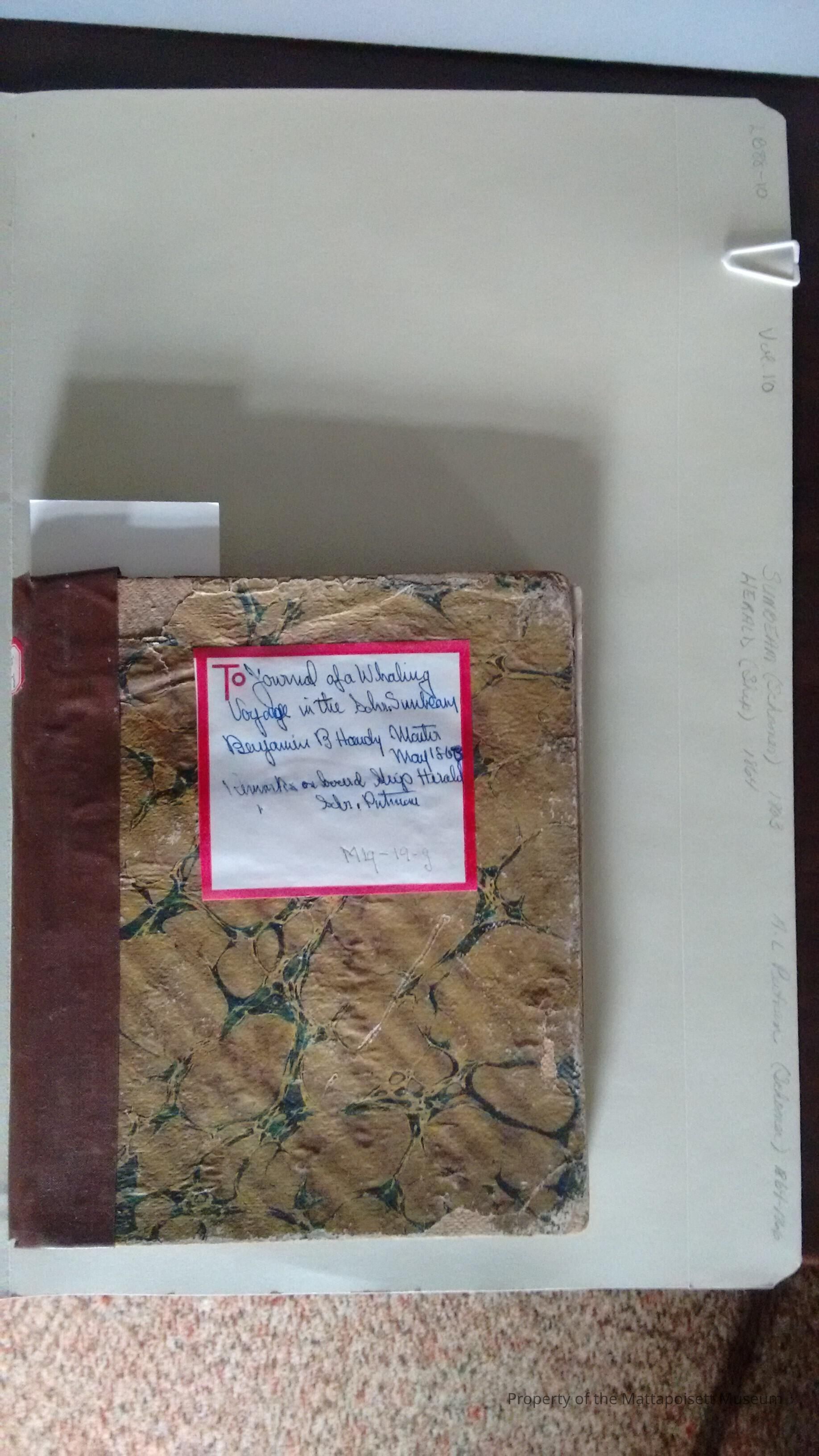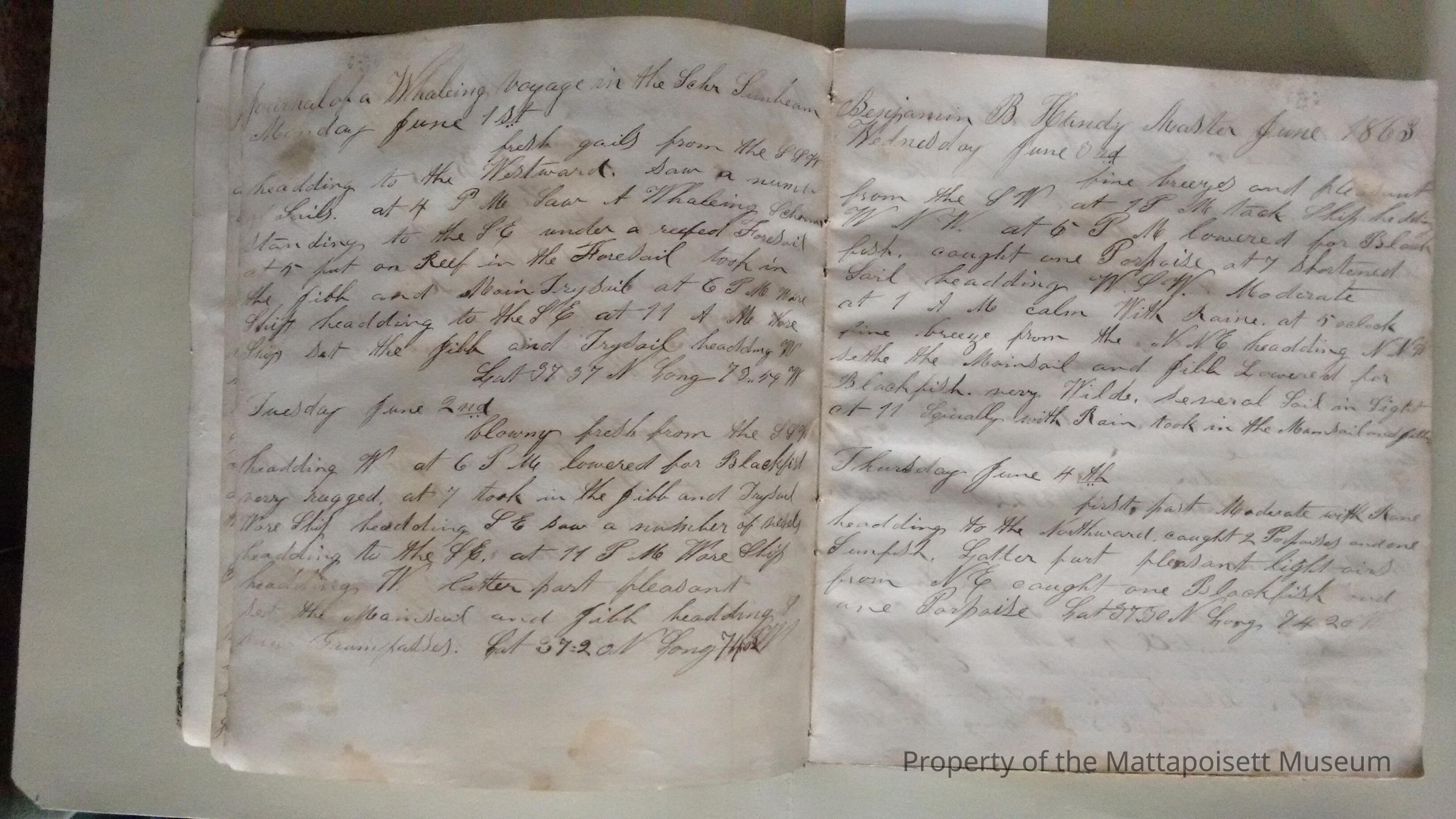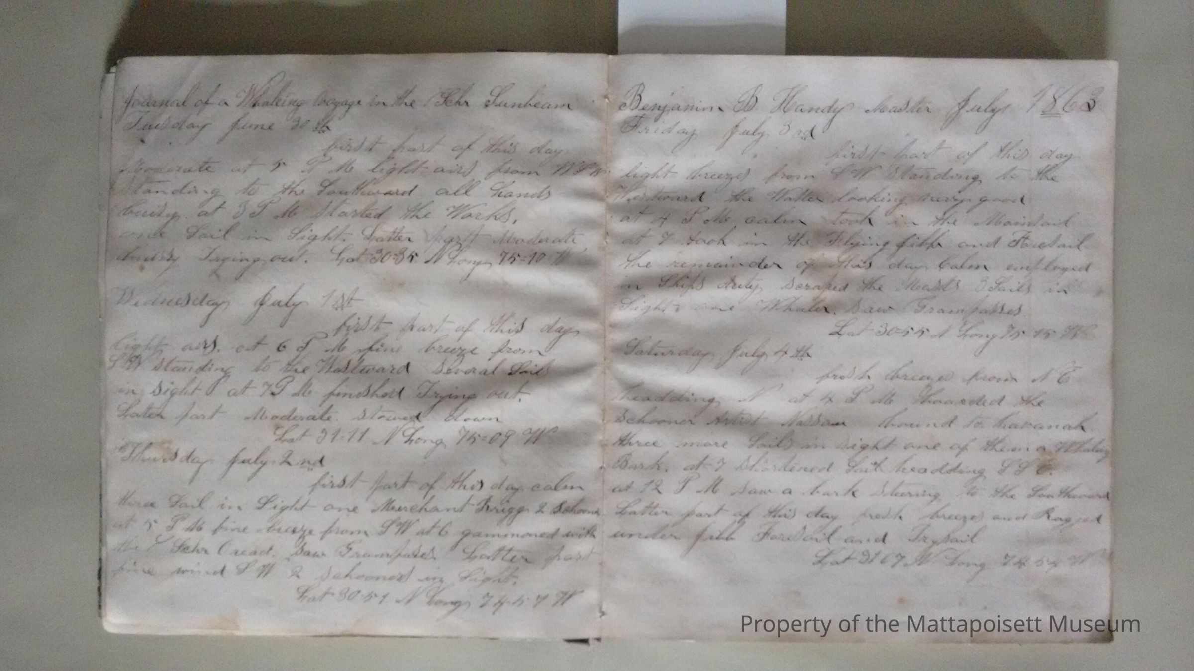 Log book of Schooner Sunbeam, Ship Herald and Schooner A. L. Putnam. Journal of a Whaling Voyage in the Scht Sunbeam, Benjamin B. Handy, Master, May 1863. Remarks on board Ship Herald of New Bedford, by Benjamin B. Handy of Marion, Mass (sailed from New Bedford, Tuesday, April 19th 1864), and remarks on board Schr. A. L. Putnam by B. B. Handy.Acquisition