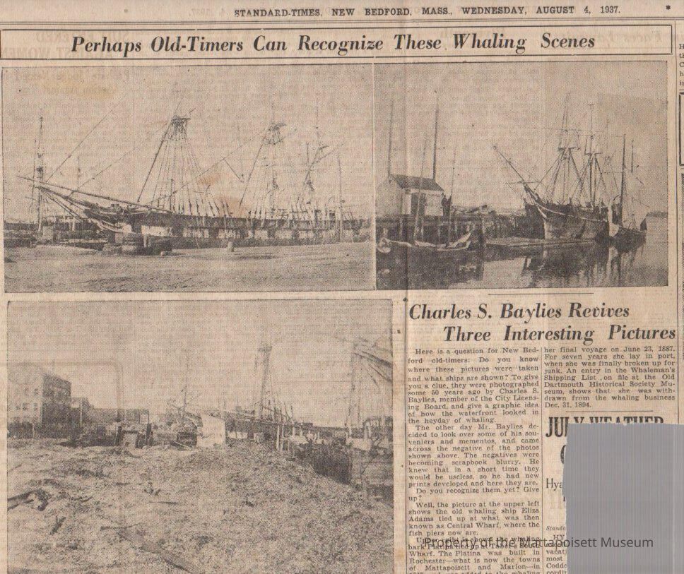 Standard-Times, August 4, 1937 pictures and article. Charles S. Baylies revives three interesting pictures. Eliza Adams at Central Wharf, Platina at Taber's South Wharf and Taber's South Wharf (New Bedford State Pier).Collection