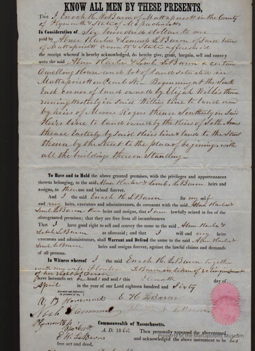 Enoch H. & Florilla F. LeBaron to Abner Harlow & Lemuel LeBaron, land and dwelling house on Pearl Street.Collection