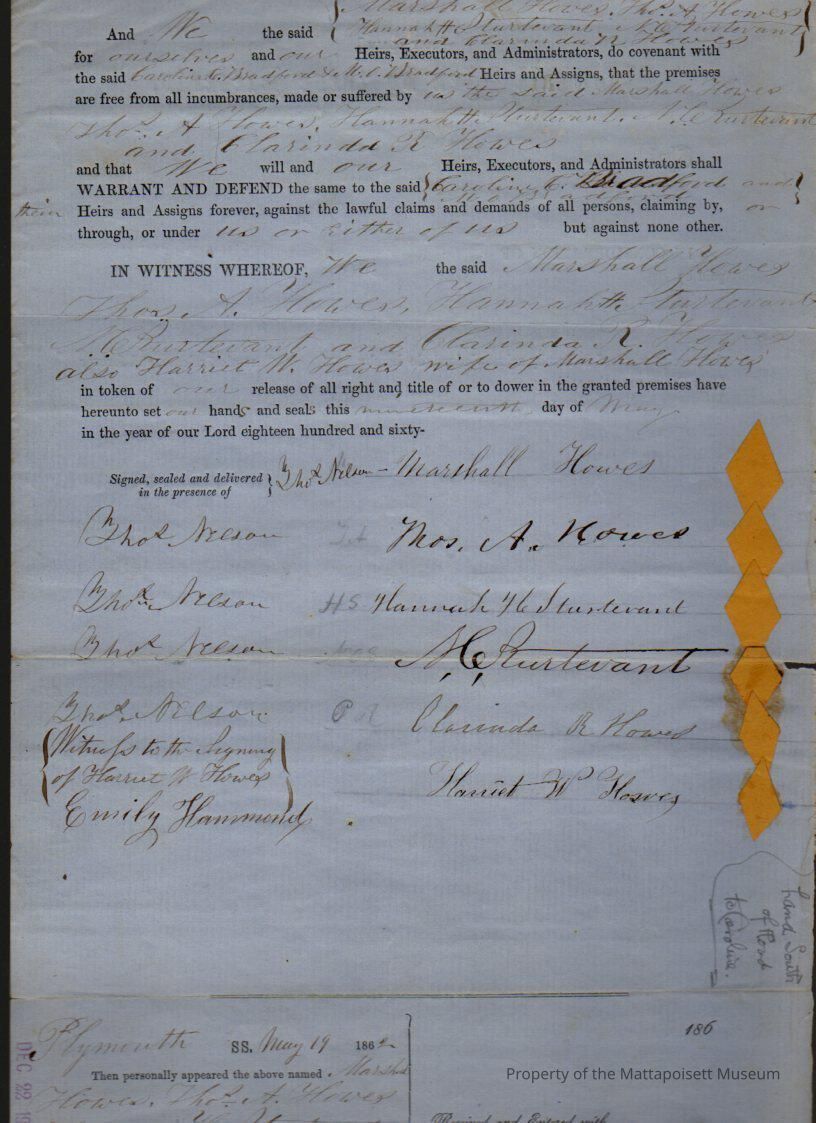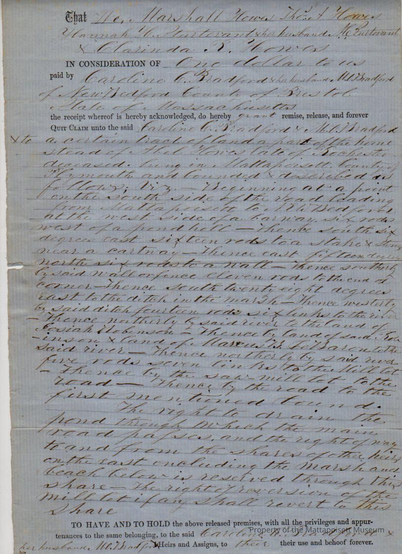 Heirs of Abel Howes; Marshall & Harriet W. Howes, Noah C. & Hannah H. Sturtevant, Claudia R. Howes, Melvin C. & Caroline C. Bradford to Caroline & Melvin O. Bradford of New Bedford, homestead land of Abel Howes for $1.Collection