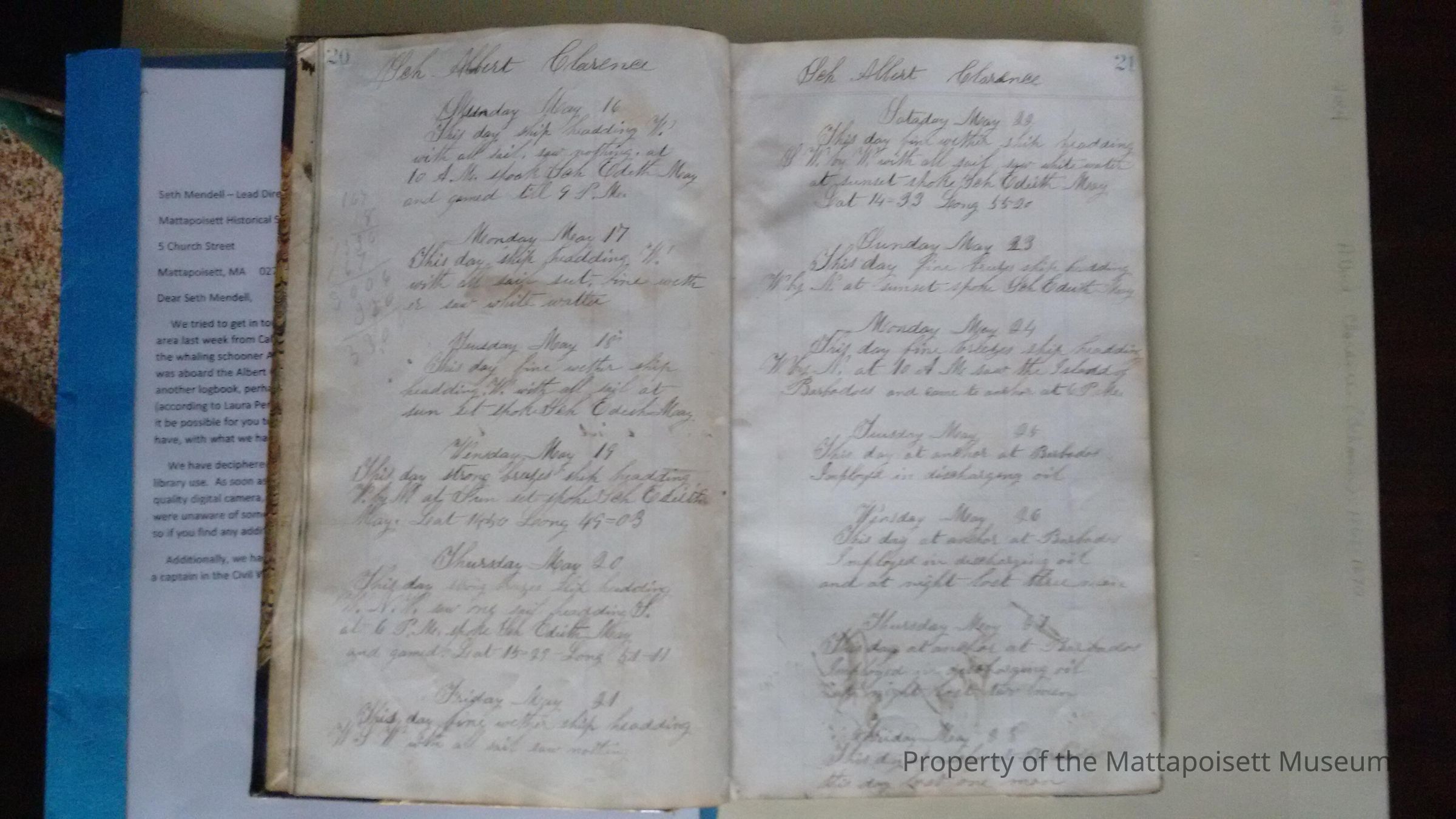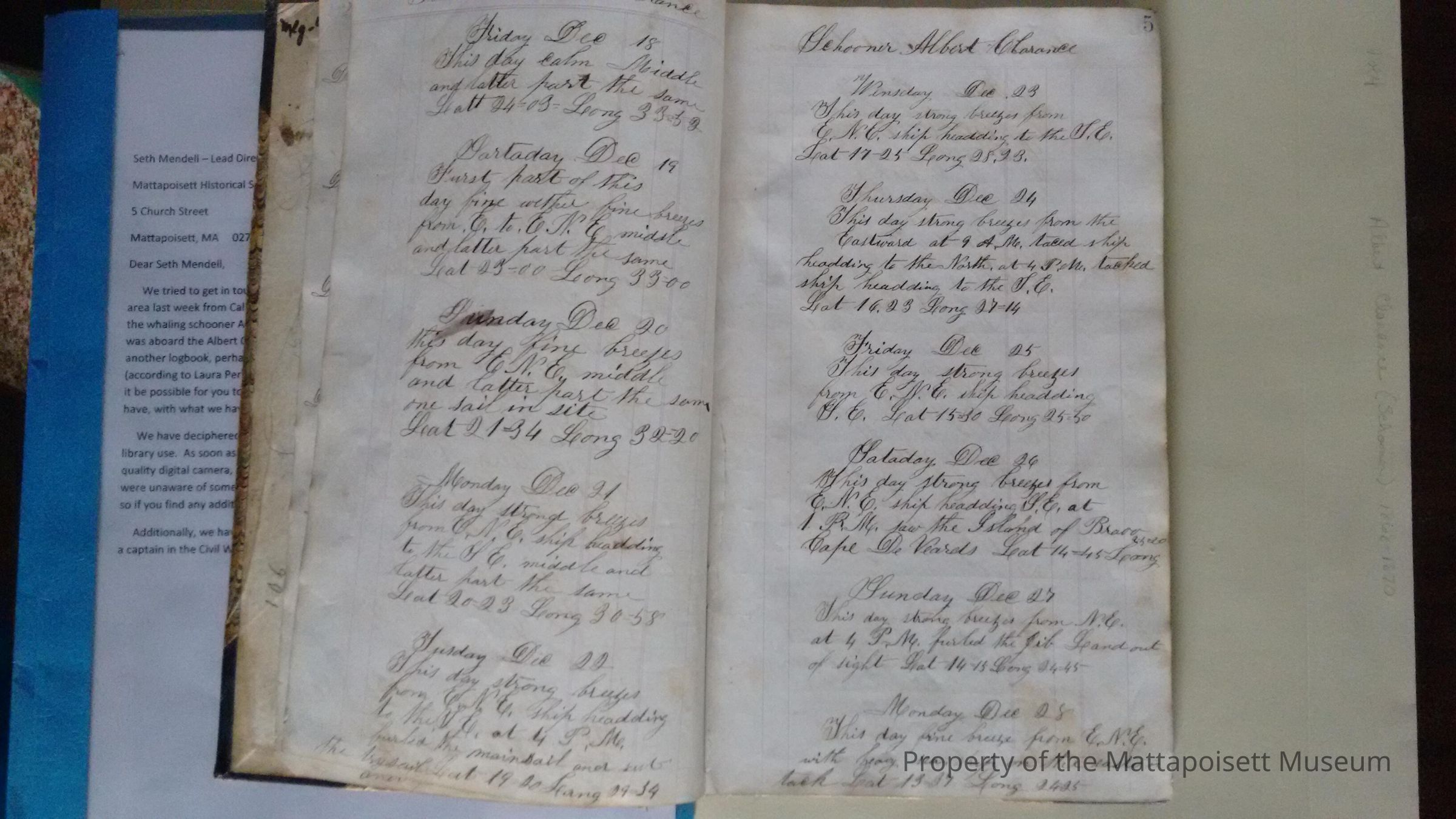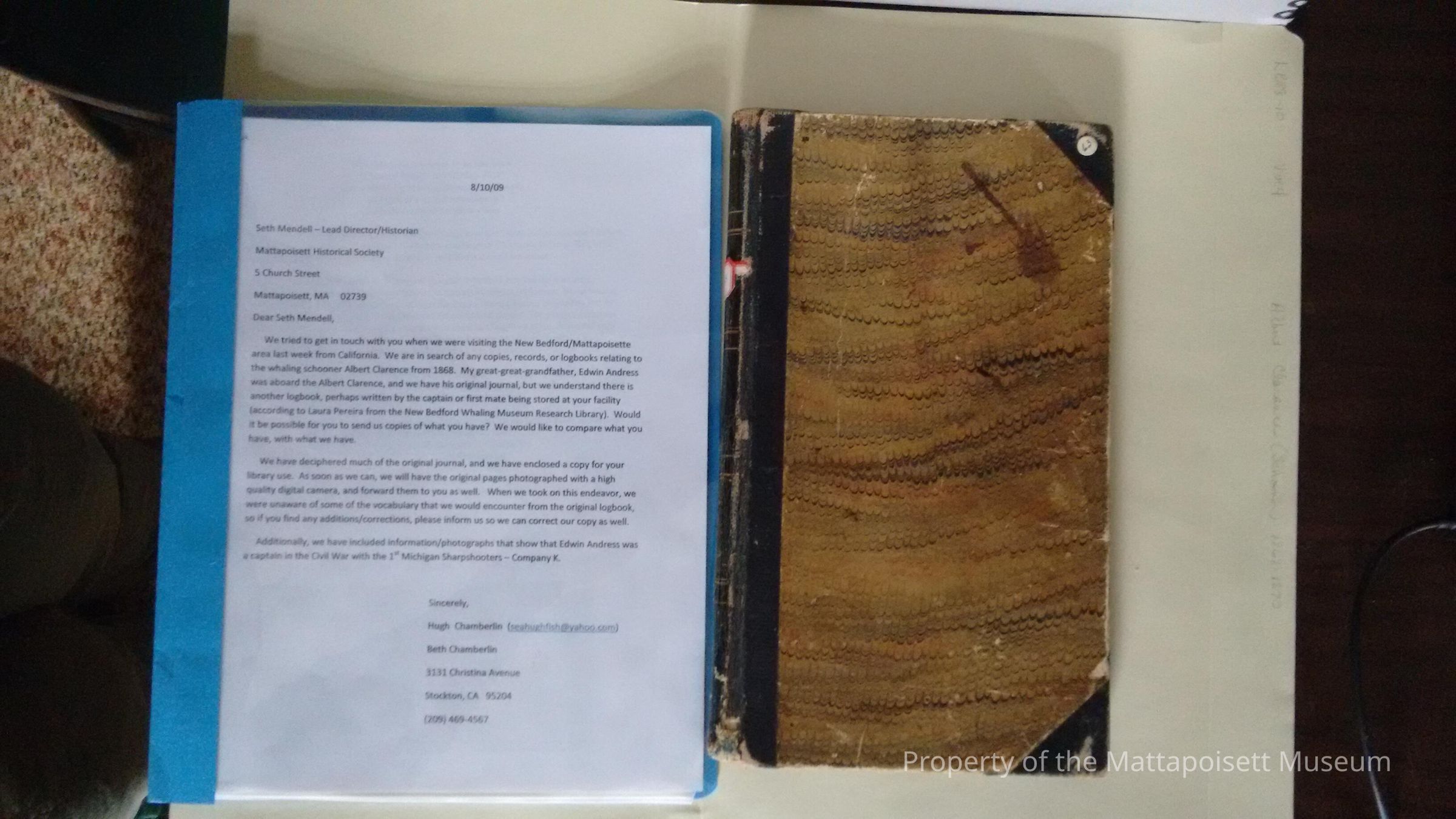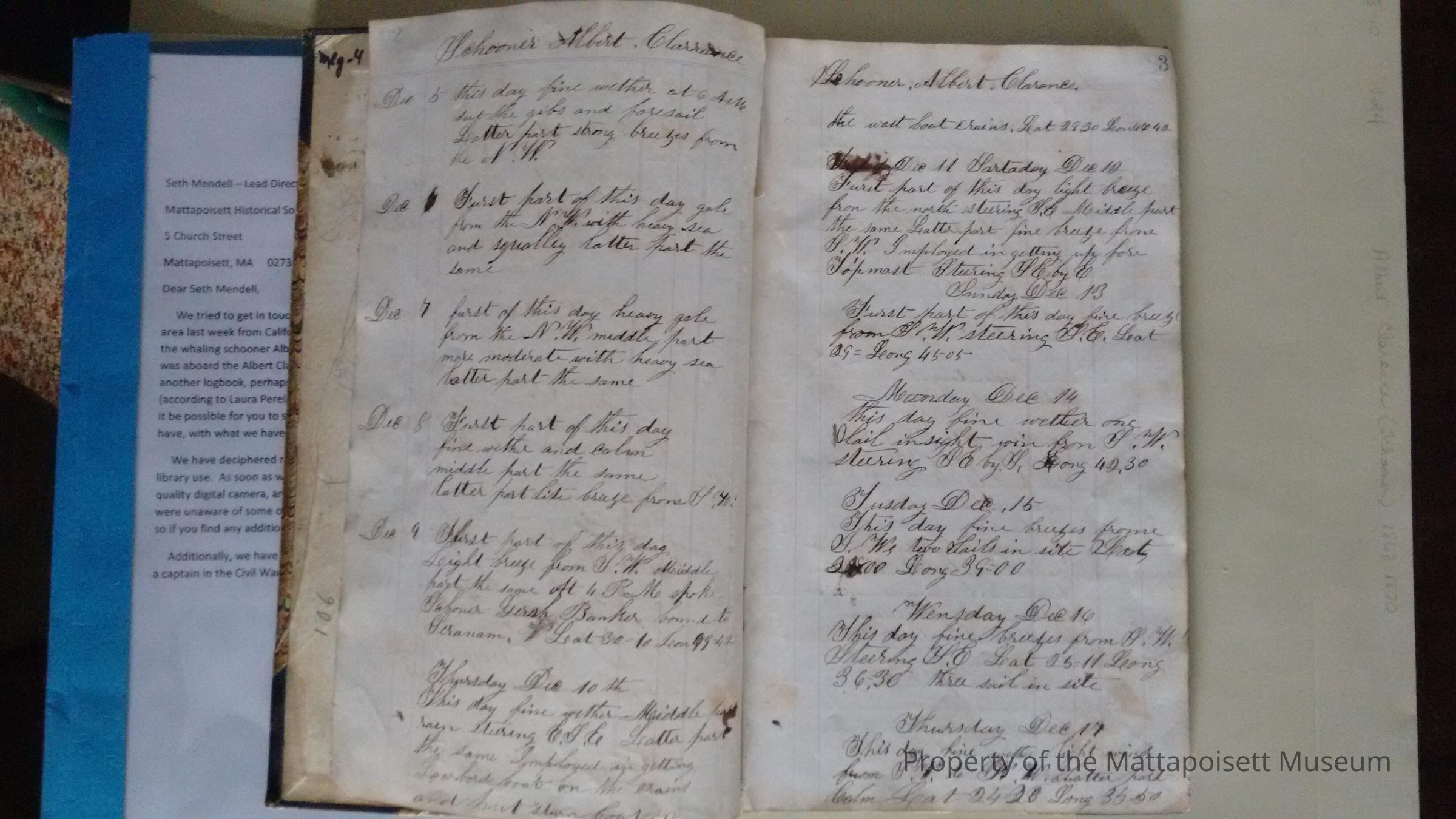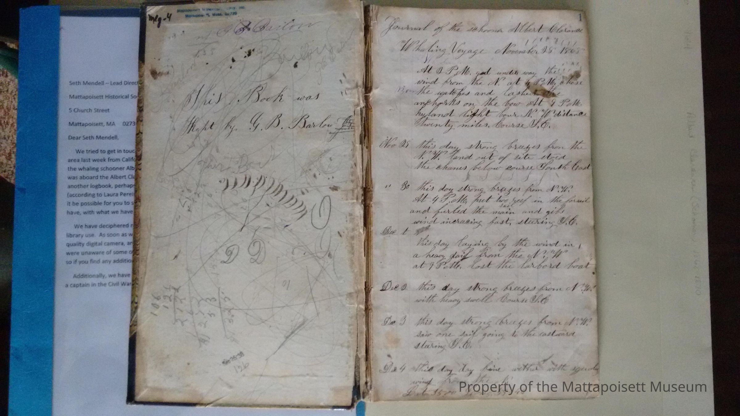 Log book of the Schooner Albert Clarance. Whaling Voyage November 28, 1868. This book was kept by G. B. Barlow Jr. Many pages missing.