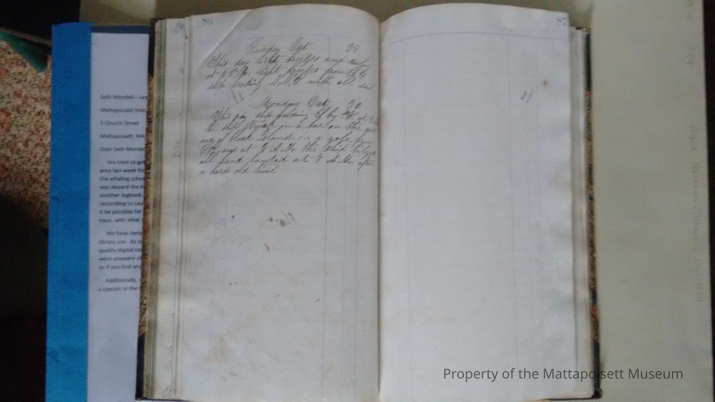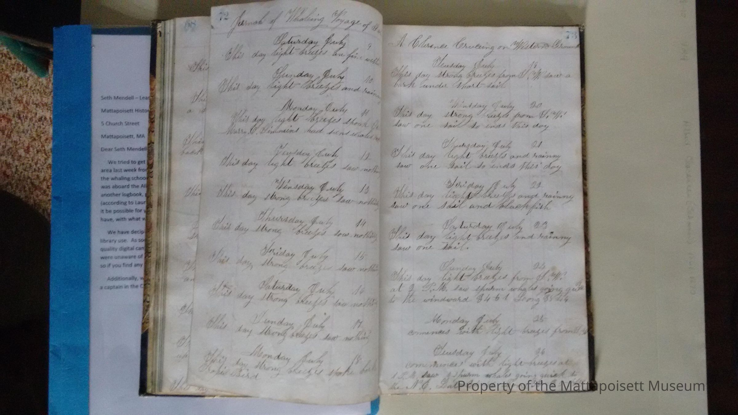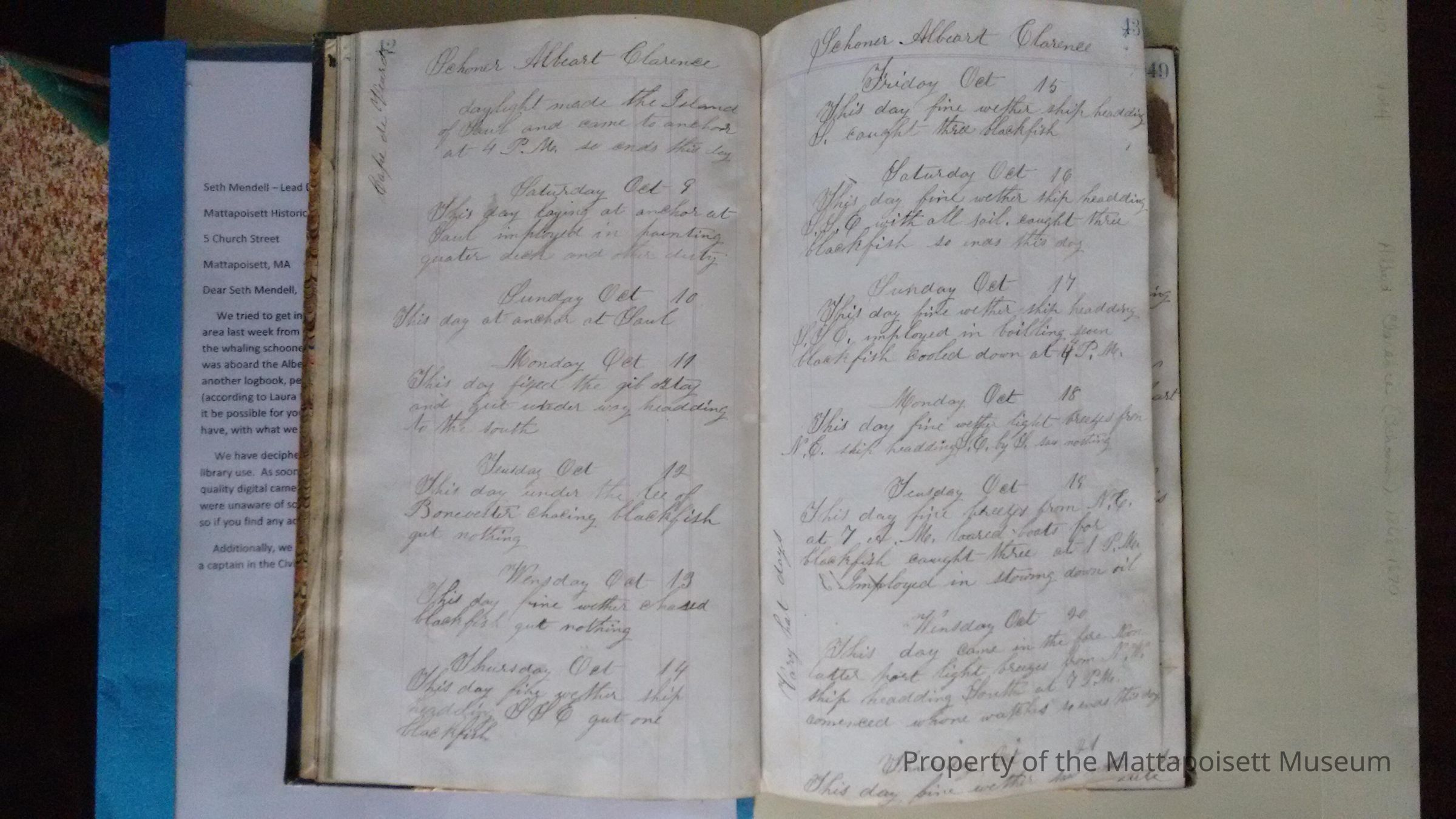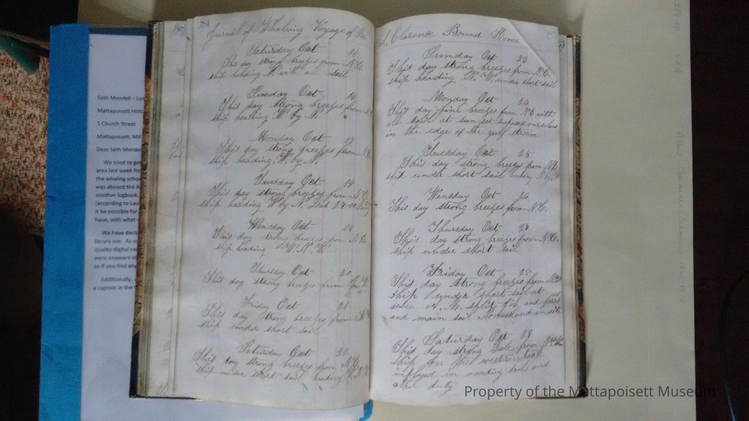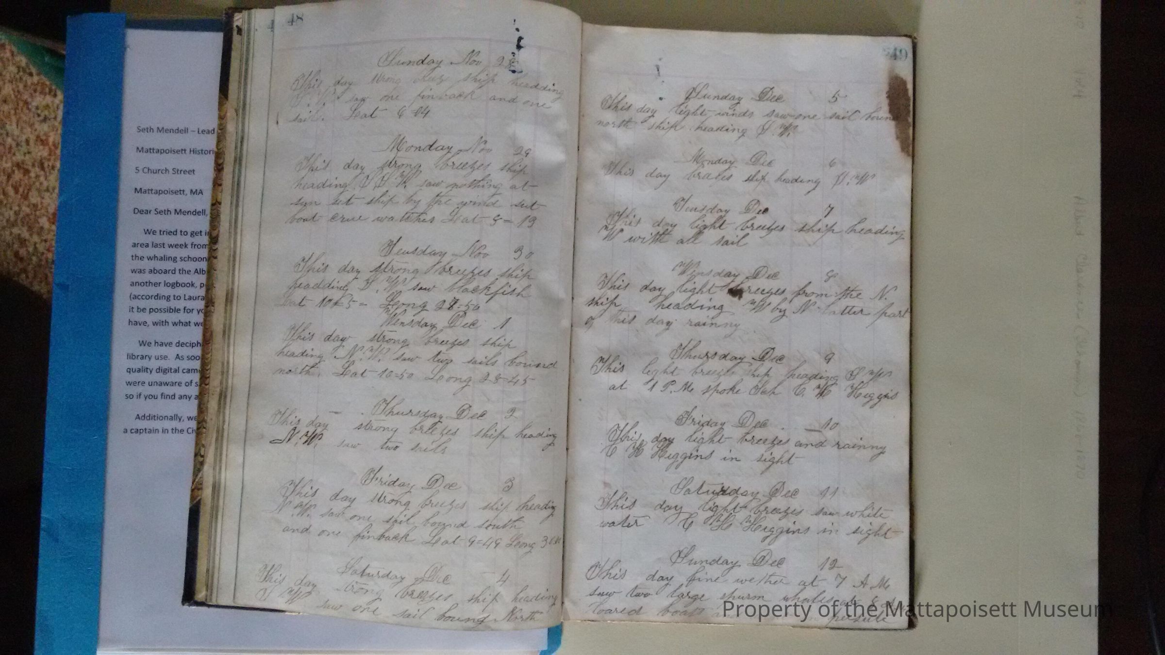 Log book of the Schooner Albert Clarance. Whaling Voyage November 28, 1868. This book was kept by G. B. Barlow Jr. Many pages missing.