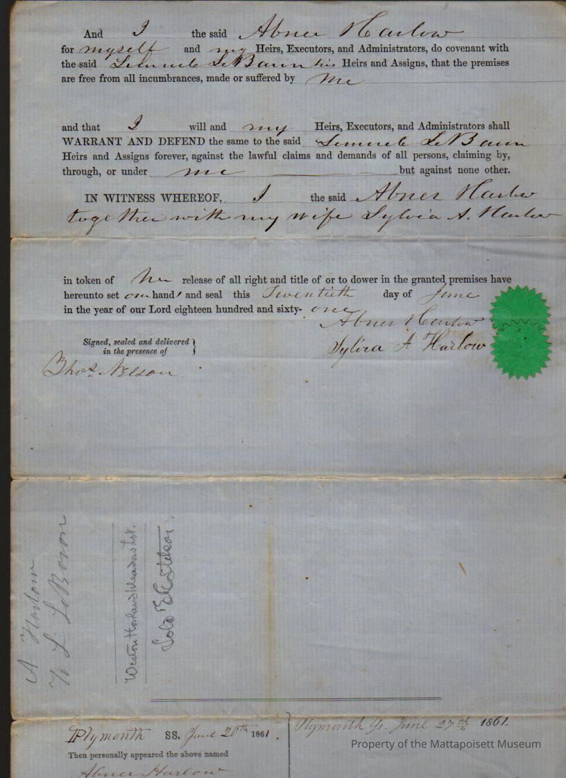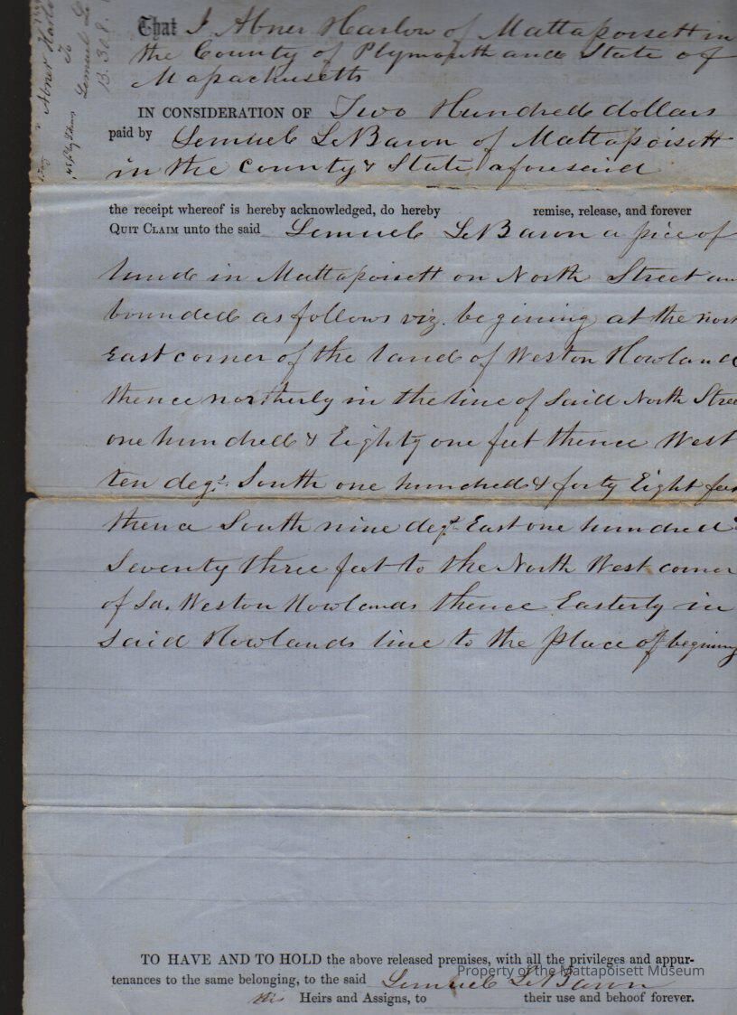 Abner & Sylvia A. Harlow to Lemuel LeBaron, land on North Street for $200.Collection