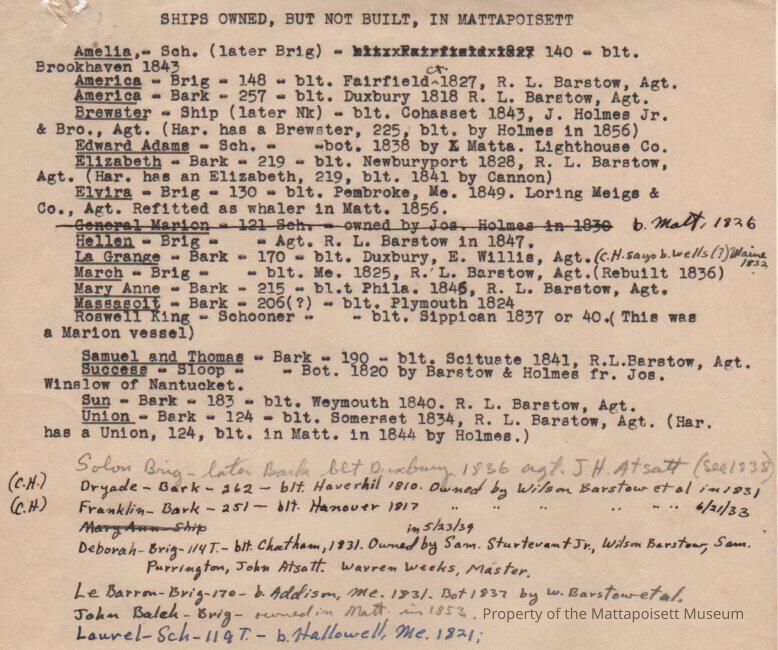 Ships owned, but not built, in Mattapoisett. Amelia, America (Brig, Bark), Brewster, Edward Adams, Elizabeth, Elvira, Hellen, La Grange, March, Mary Anne, Massasoit, Samuel Thomas, Success, Sun, Union, Solon, Dryade, Franklin, Deborah, LeBarron, John Balek, LaurelCollection