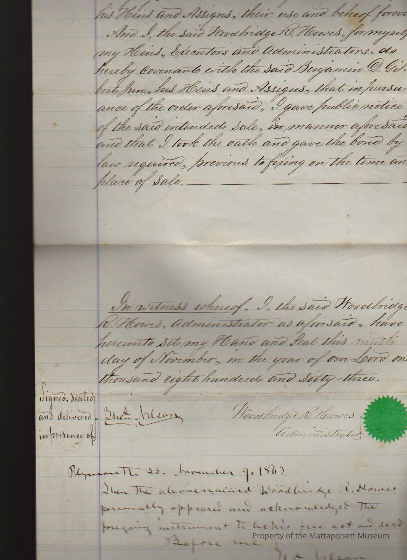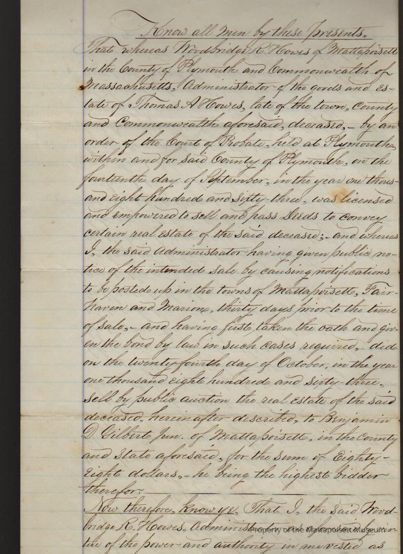 Woodbridge R. Howes, administrator to the estate of Thomas A. Howes to Benjamin D. Gilbert Jr., land for $88.Collection