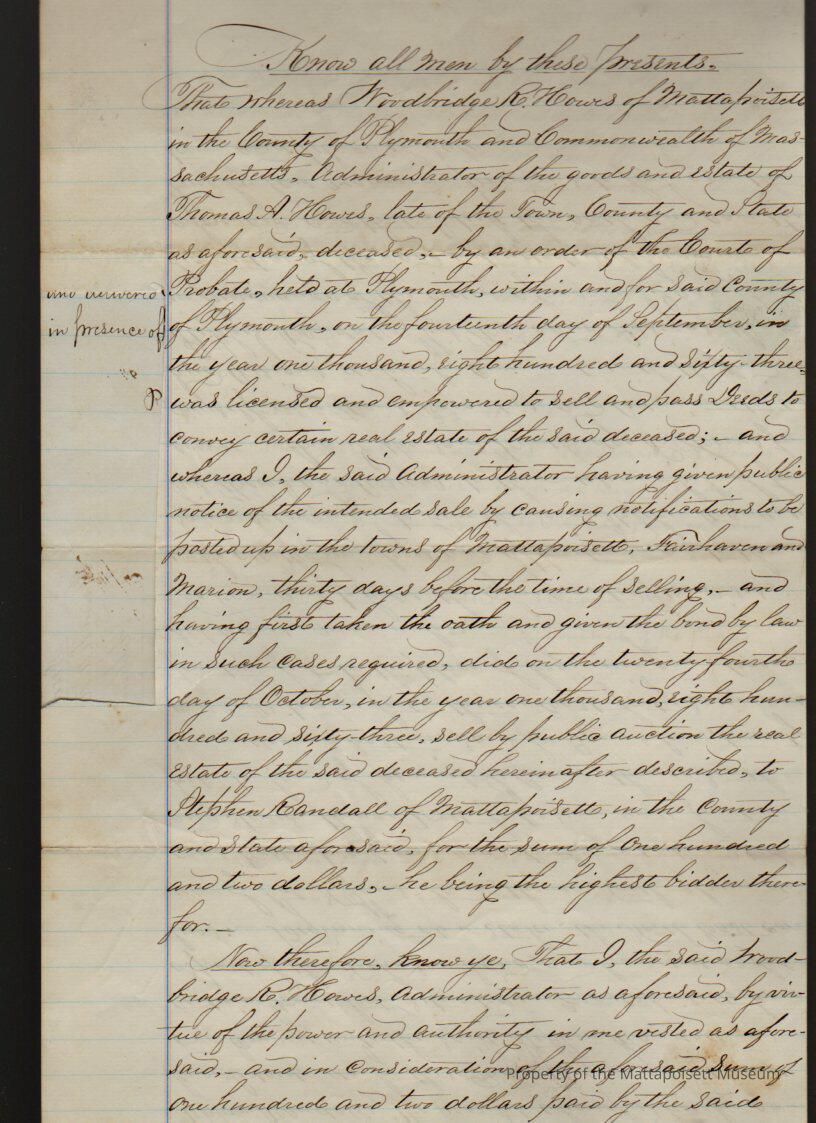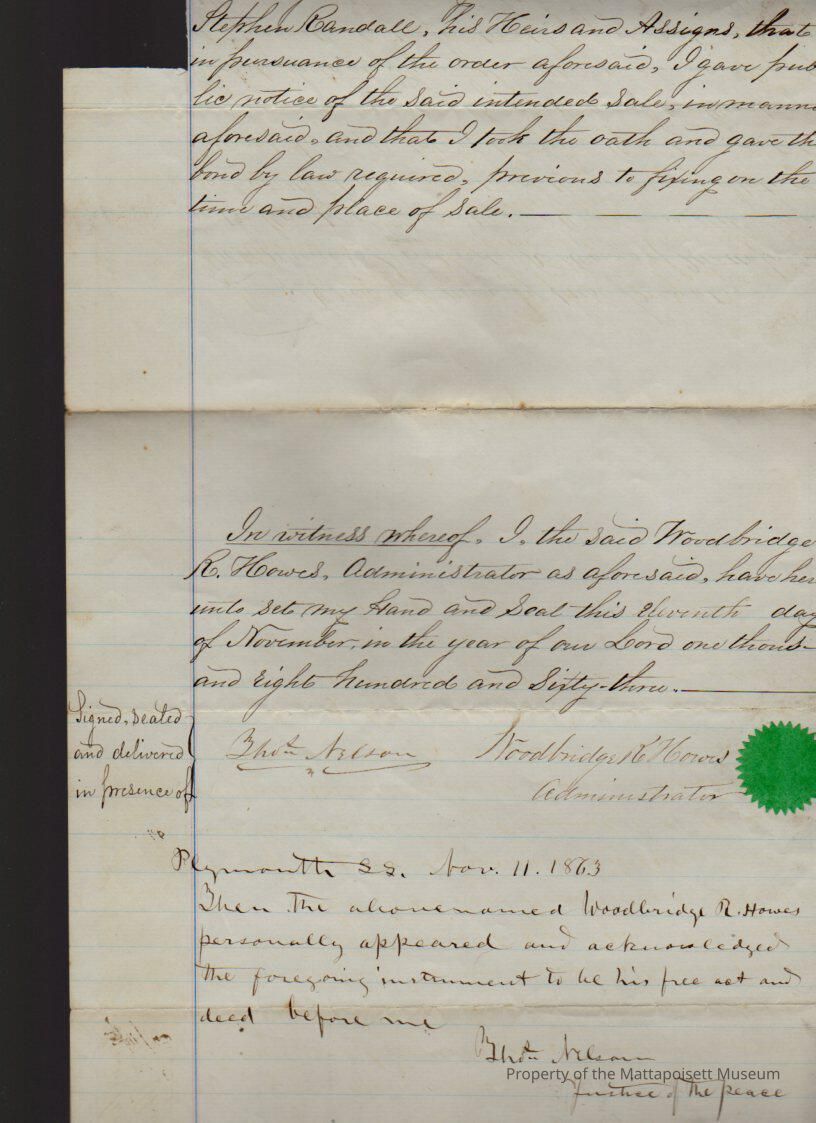 Woodbridge R. Howes, administrator to the estate of Thomas A. Howes to Stephen Randall, land for $102.Collection
