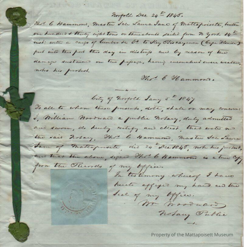Letter to Thomas C. Hammond, Master of Schooner "Laura Jane" from Wm. Woodward, Notary PublicCollection