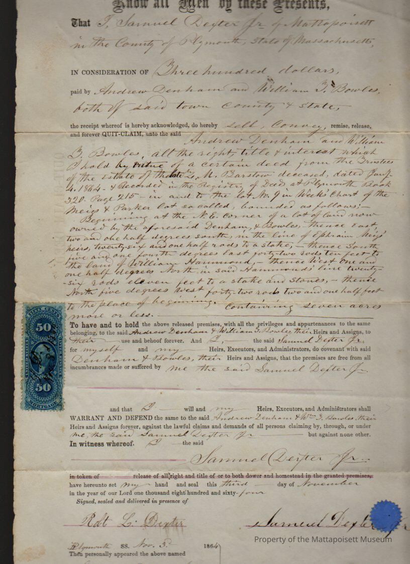 Samuel Dexter Jr. to Andrew Denham & William B. Bowles, by virtue of a deed from the trustees of Z. M. Barstow, Lot #9 of Meigs & Parker Lot for $300.Collection