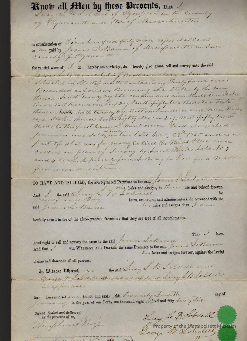 Lucy LeBaron & George W. Lobdell to James LeBaron, 15 ¾ acres for $549.94.Collection