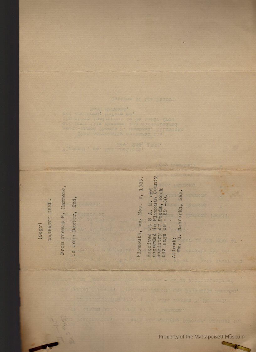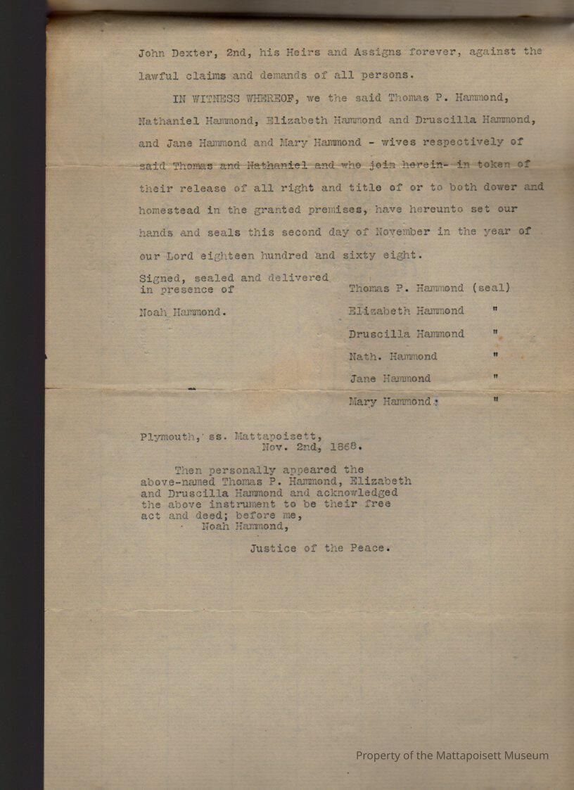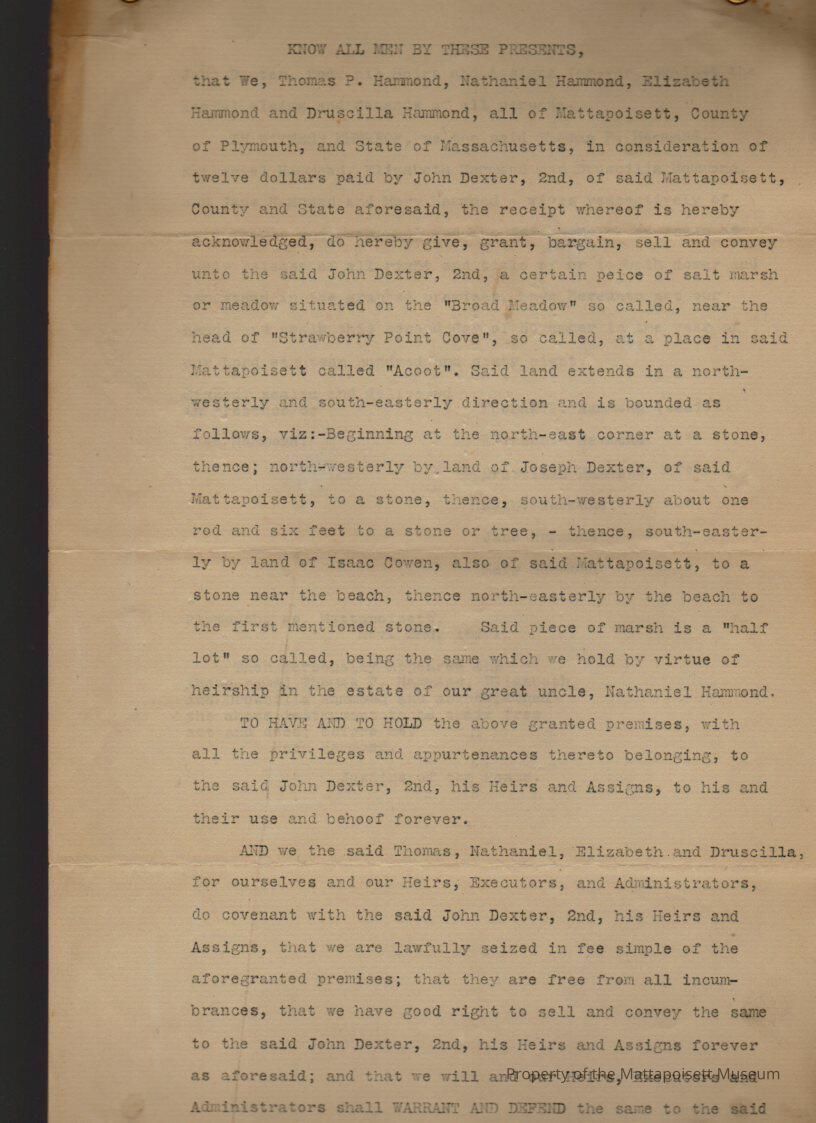 Thomas R. Hammond, Nathaniel Hammond, Elizabeth Hammond, Drucilla Hammond, Jane Hammond & Mary Hammond to John Dexter II, salt marsh/meadow in “Acoot” for $12. Copy.Collection
