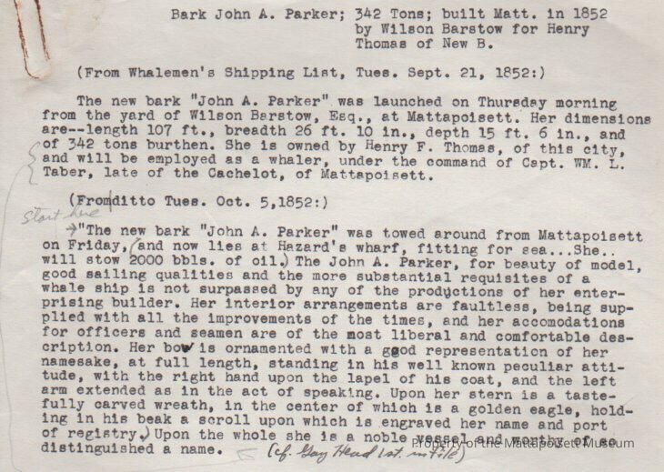 History and Whalemen's Shipping List articles about Bark "John A. Parker".