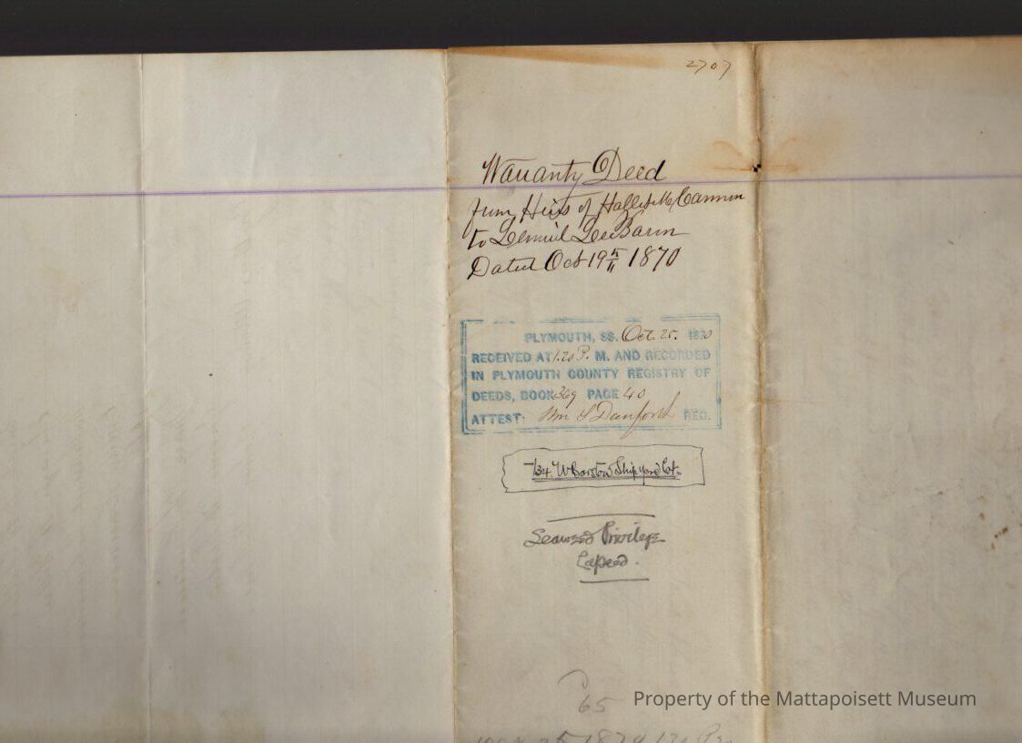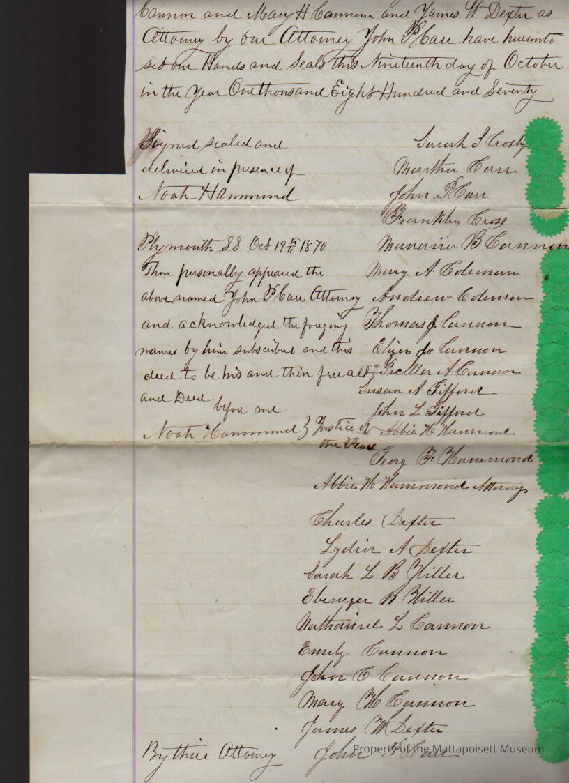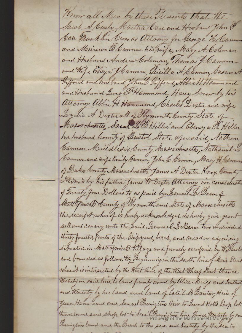 Sarah S. Crosby, et al (heirs of Hallisell Cannon) to Lemuel LeBaron. Shipyard, beach and meadow in Mattapoisett Village for $24.Collection