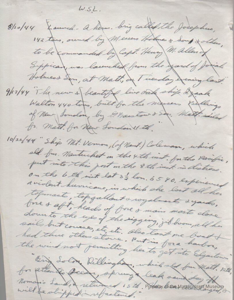 Whalemen's Shipping List article nores on Ship "Mt. Vernon". Some article notes crossed off.