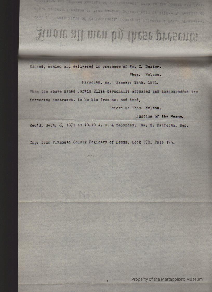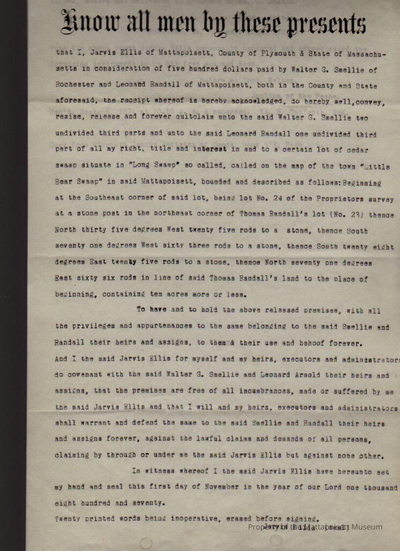 Jarvis Ellis to Walter G. Smellie of Rochester & Leonard Randall, 10 acres of cedar swamp known as “Long Swamp”.Collection