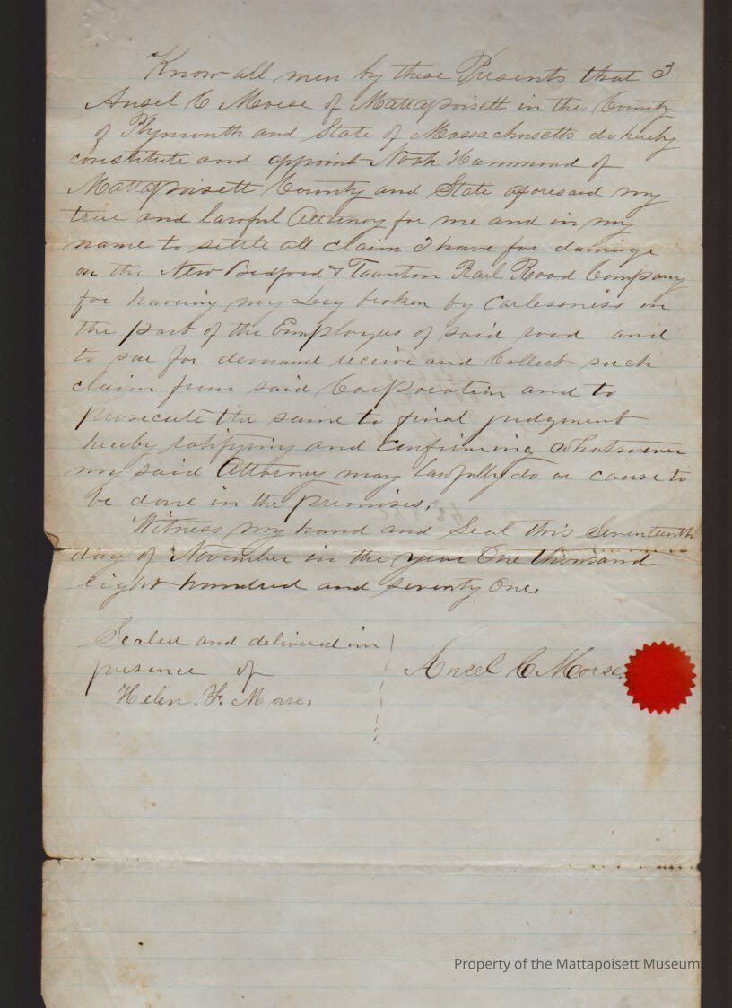 Ansel C. Morse, Power of Attorney to Noah Hammond in settlement of claims for damages of broken leg on New Bedford & Taunton Railroad Co.Collection