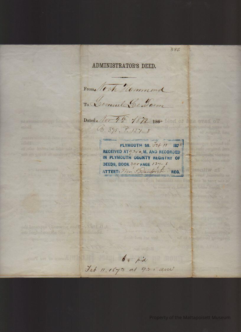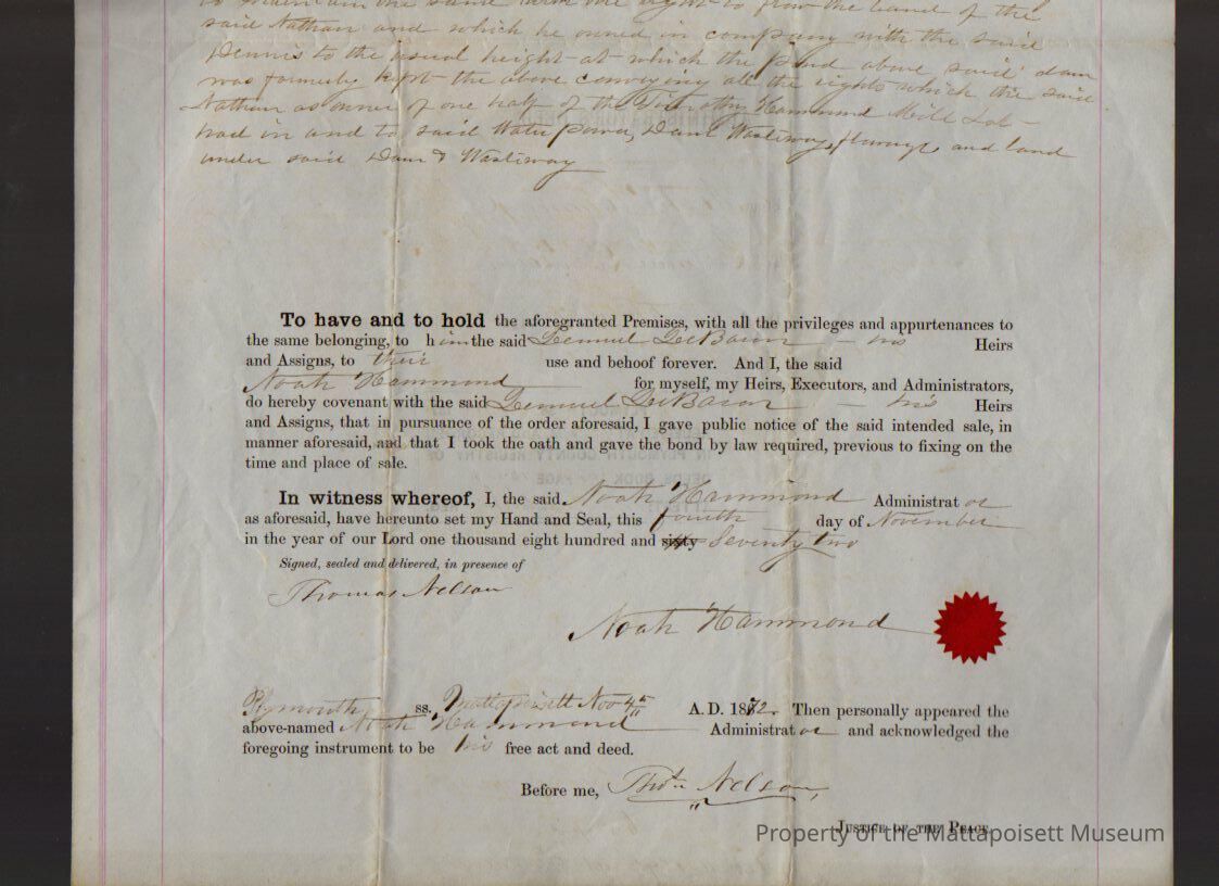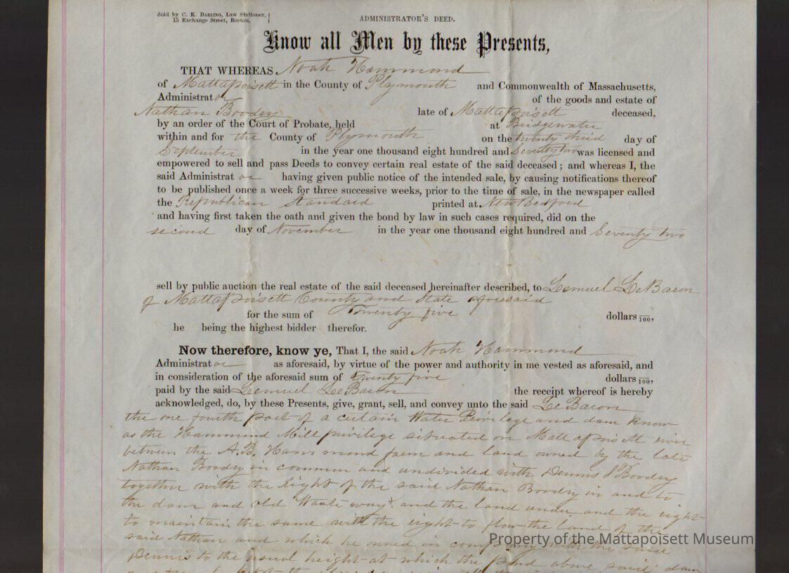Noah Hammond, administrator of the Nathan Boodry estate, to Lemuel LeBaron, water & dam privileges at Hammond Mill.Collection