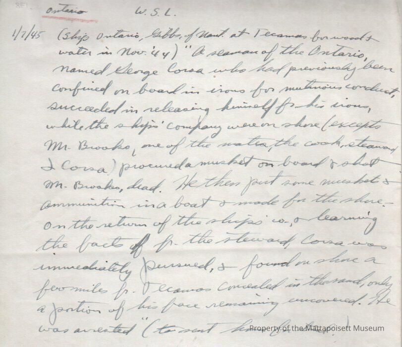 Whalemen's Shipping List article about Ship "Ontario" (of Nantucket) about a mutunious George Corsa who shot and killed Mr. Andrew B. Brooks, 1st mate.Collection