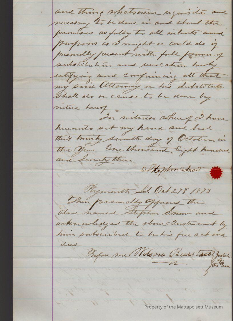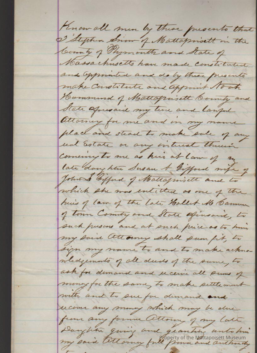 Stephen Snow, Power of Attorney to Noah Hammond for the sale of real estate of daughter, Susan A. Gifford and her husband John L. Gifford.Collection