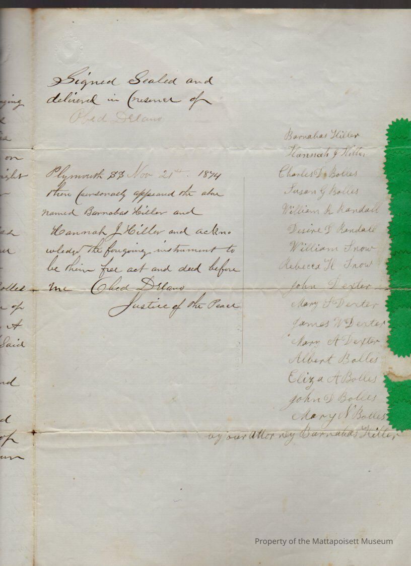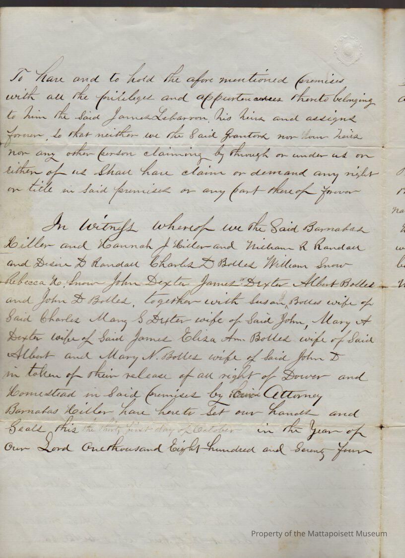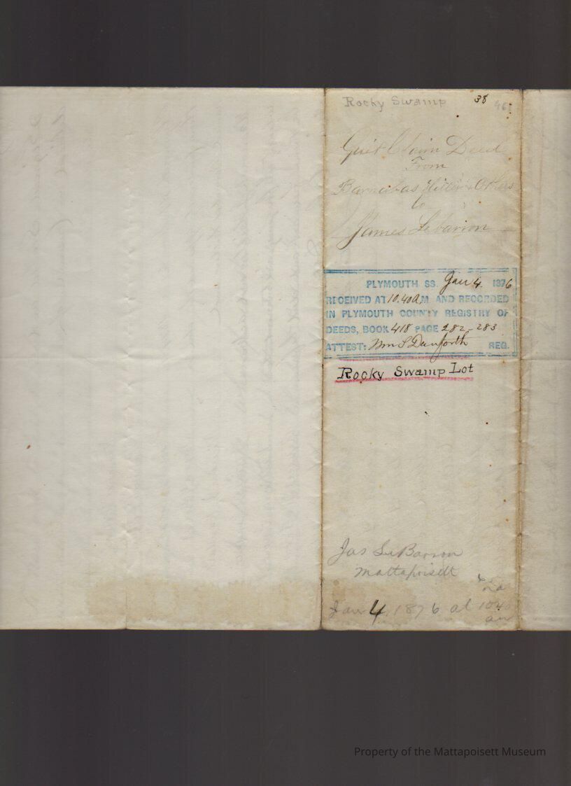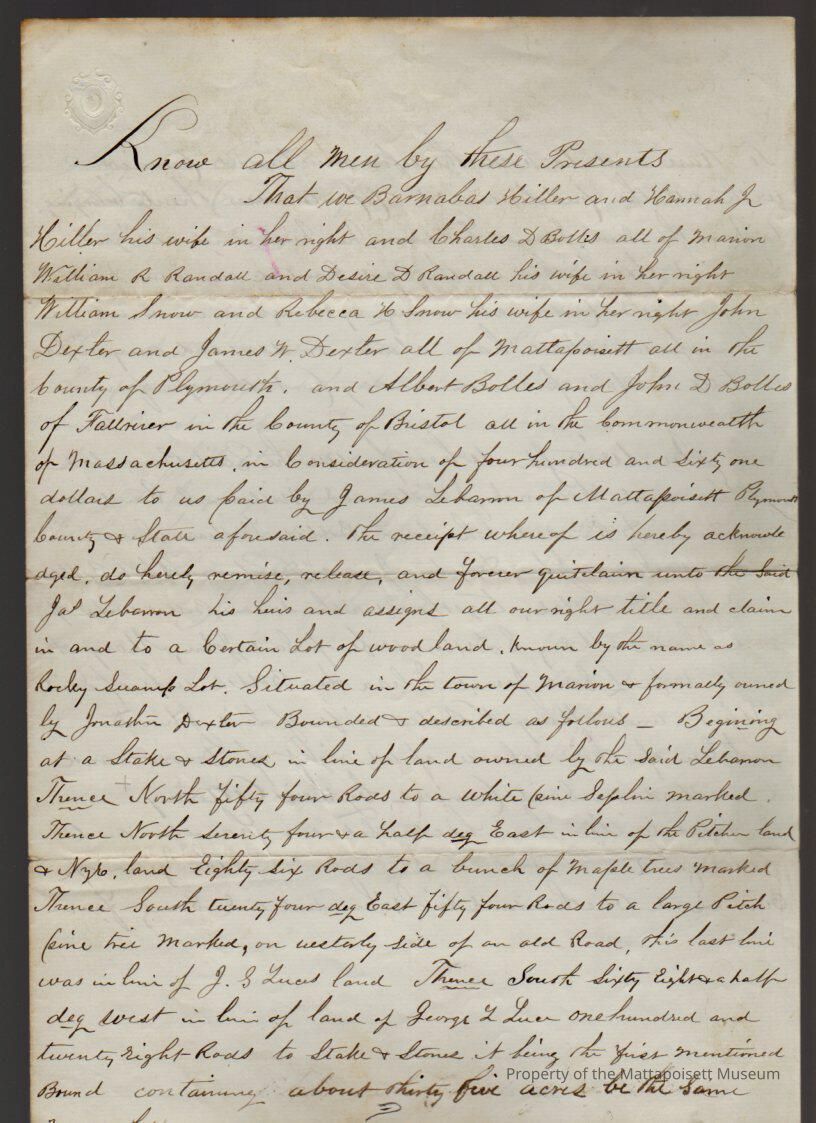 Barnabas & Hannah J. Hiller, et al to James LeBaron, 35 acres of wood lot at “Rocky Swamp” in Marion for $461.Collection